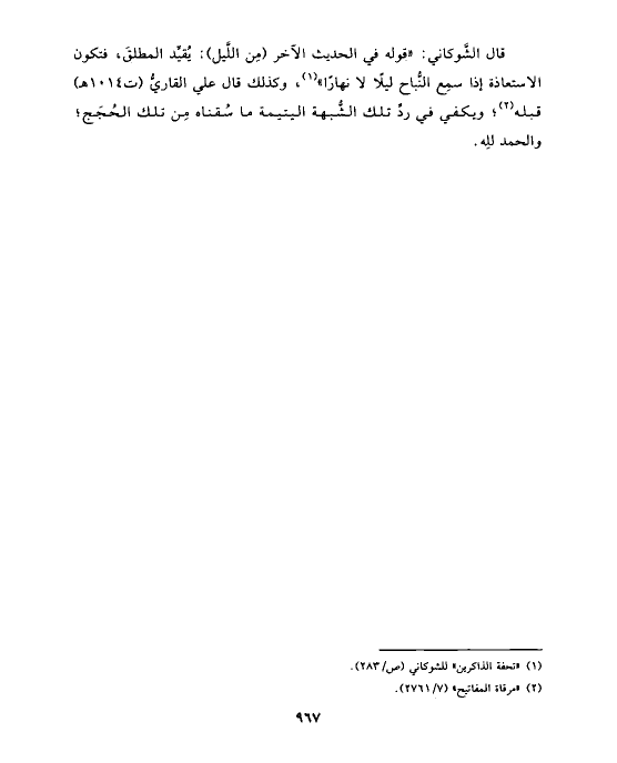قال الشَّوكاني: «قوله في الحديث الآخر (مِن اللَّيل): يُقيِّد المطلقَ، فتكون الاستعاذة إذا سمِع النُّباح ليلًا لا نهارًا» (¬١)، وكذلك قال علي القاريُّ (ت ١٠١٤ هـ) قبله (¬٢)؛ ويكفي في ردِّ تلك الشُّبهة اليتيمة ما سُقناه مِن تلك الحُجَج؛ والحمد للِه.