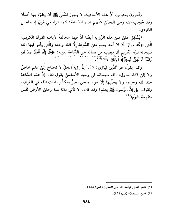 وآخرون يَعتبرون أنَّ هذه الأحاديث لا يجوز للنَّبي صلى الله عليه وسلم أن يتفوَّه بها أصلًا وقد حُجِب عنه وعن الخلقِ كلِّهم علم السَّاعة؛ كما تراه في قولِ إسماعيل الكردي: