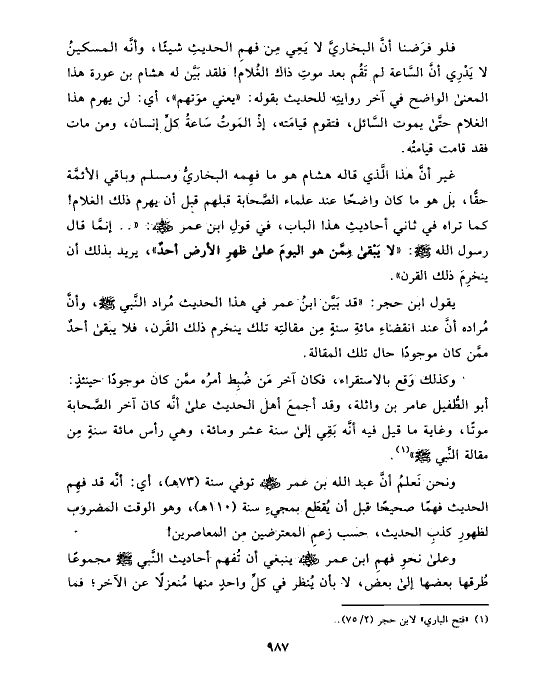 غير أنَّ هذا الَّذي قاله هشام هو ما فهِمه البخاريُّ ومسلم وباقي الأئمَّة حقًّا، بل هو ما كان واضحًا عند علماء الصَّحابة قبلهم قبل أن يهرم ذلك الغلام! كما تراه في ثاني أحاديثِ هذا الباب، في قولِ ابن عمر رضي الله عنه: « .. إنمَّا قال رسول الله صلى الله عليه وسلم: «لا يَبْقى مِمَّن هو اليومَ على ظهرِ الأرض أحدٌ»، يريد بذلك أن ينخرِمَ ذلك القرن».