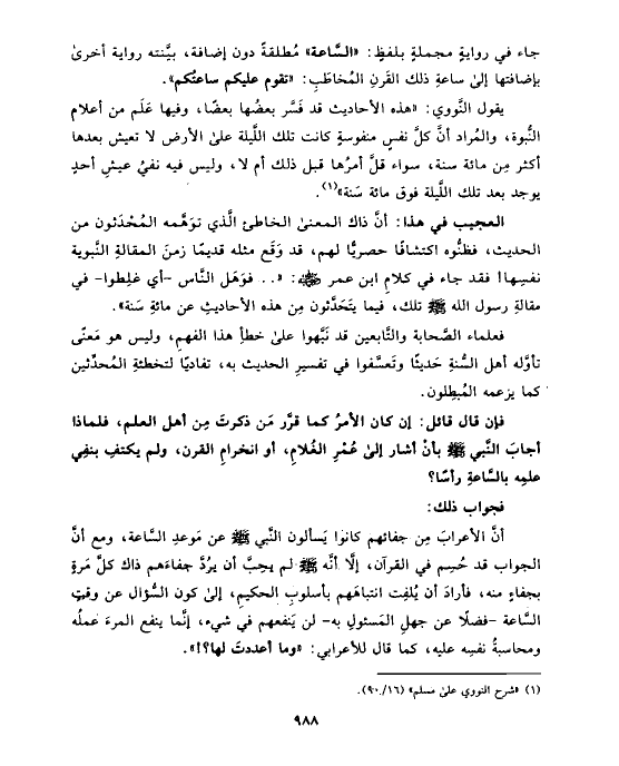 يقول النَّووي: «هذه الأحاديث قد فَسَّر بعضُها بعضًا، وفيها عَلَم من أعلام النُّبوة، والمُراد أنَّ كلَّ نفسٍ منفوسةٍ كانت تلك اللَّيلة على الأرض لا تعيش بعدها أكثر مِن مائة سنة، سواء قلَّ أمرُها قبل ذلك أم لا، وليس فيه نفيُ عيشِ أحدٍ يوجد بعد تلك اللَّيلة فوق مائة سَنة» (¬١).