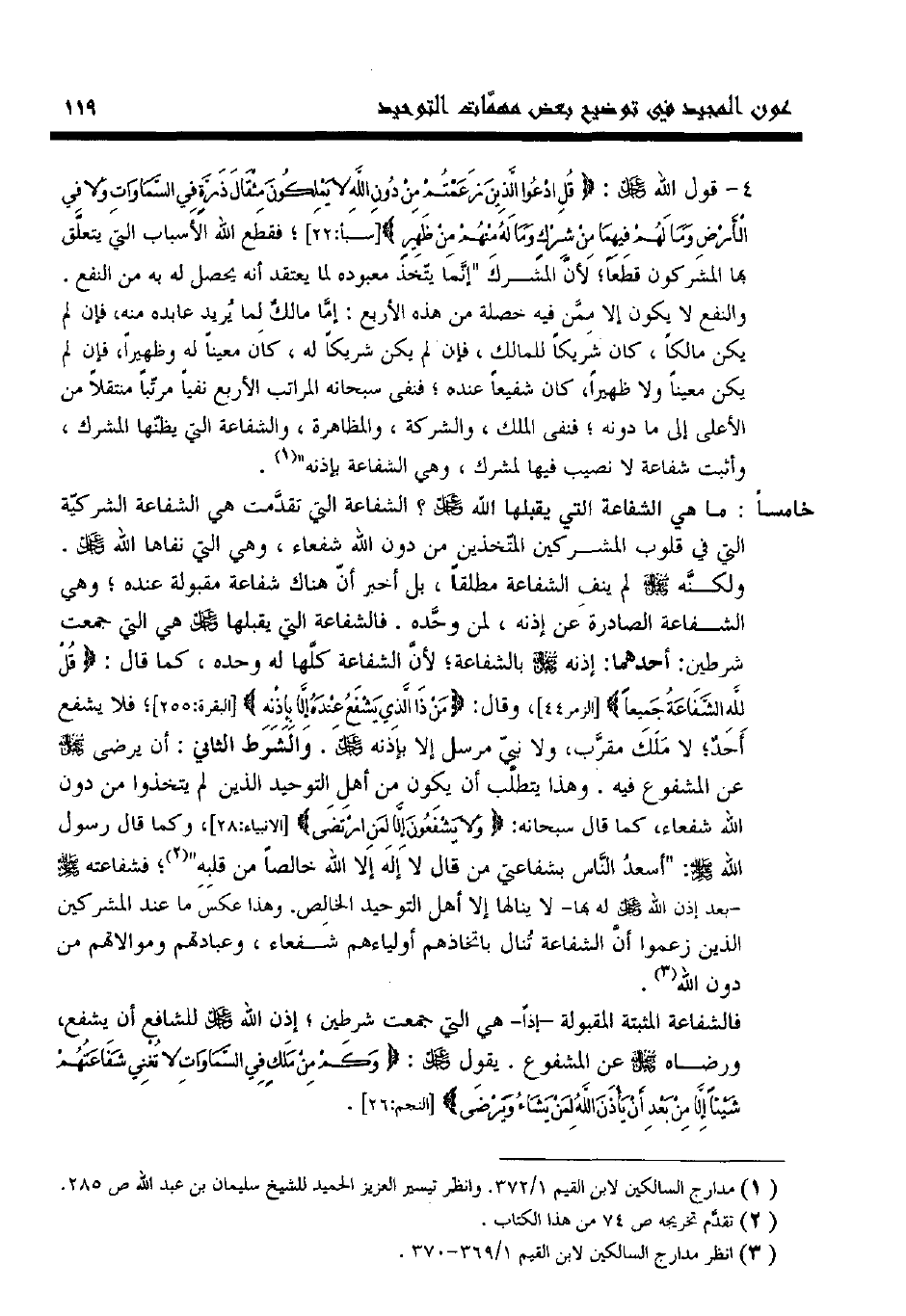 4- قول الله عز وجل: {قُلِ ادْعُوا الَّذِينَ زَعَمْتُمْ مِنْ دُونِ اللَّهِ لا يَمْلِكُونَ مِثْقَالَ ذَرَّةٍ فِي السَّمَاوَاتِ وَلا فِي الْأَرْضِ وَمَا لَهُمْ فِيهِمَا مِنْ شِرْكٍ وَمَا لَهُ مِنْهُمْ مِنْ ظَهِيرٍ} [سبأ: 22] ؛ فقطع الله الأسباب التي يتعلق بها المشركون قطعا؛ لأن المشرك إنما يتخذ معبوده لما يعتقد أنه يحصل له به من النفع.