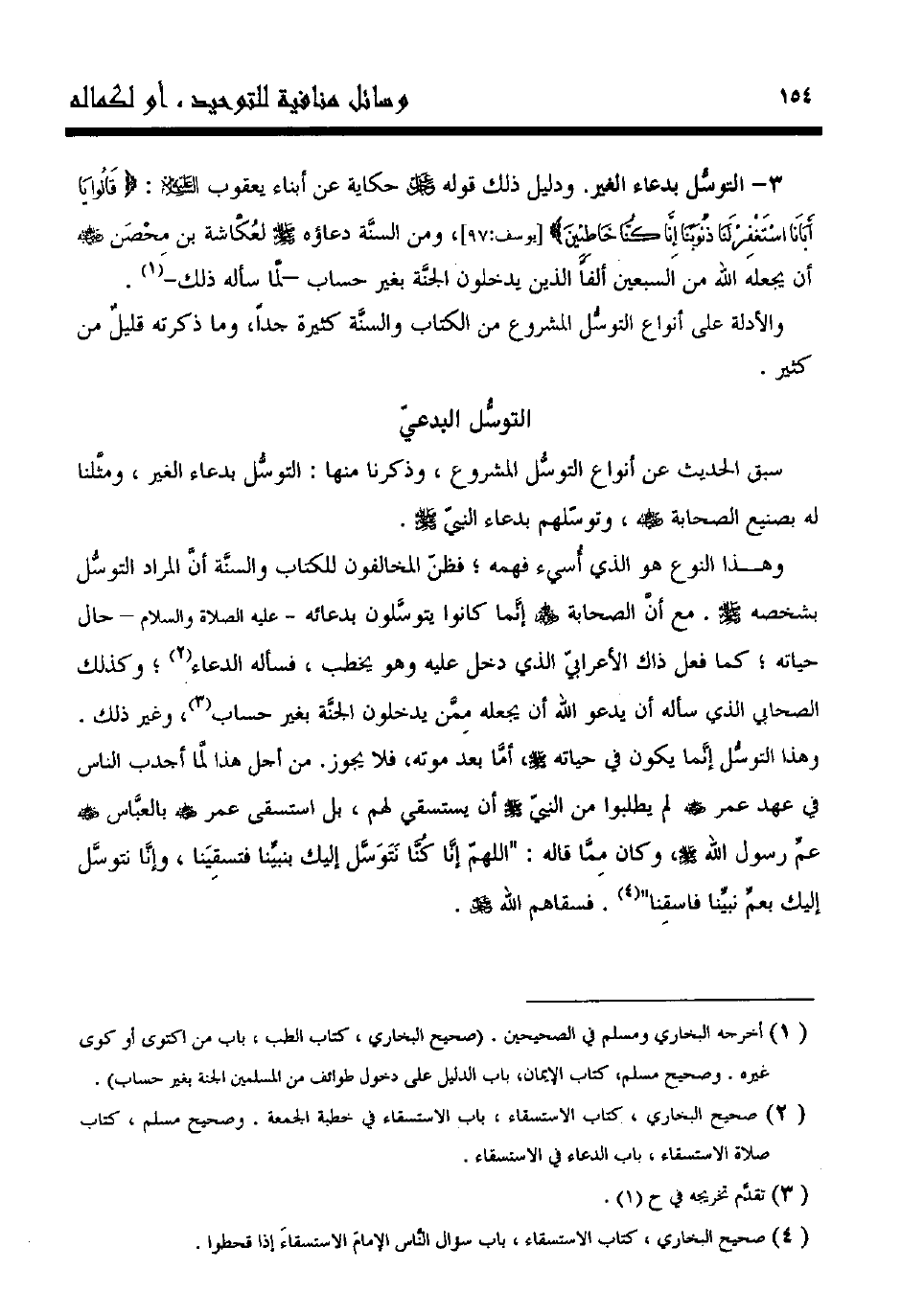 وهذا النوع هو الذي أسيء فهمه؛ فظن المخالفون للكتاب والسنة أن المراد التوسل بشخصه صلى الله عليه وسلم. مع أن الصحابة رضي الله عنهم إنما كانوا يتوسلون بدعائه -عليه الصلاة والسلام- حال حياته؛ كما فعل ذاك الأعرابي الذي دخل عليه وهو يخطب، فسأله الدعاء2؛ وكذلك الصحابي الذي سأله أن يدعو الله أن يجعله ممن يدخلون الجنة بغير حساب3، وغير ذلك.