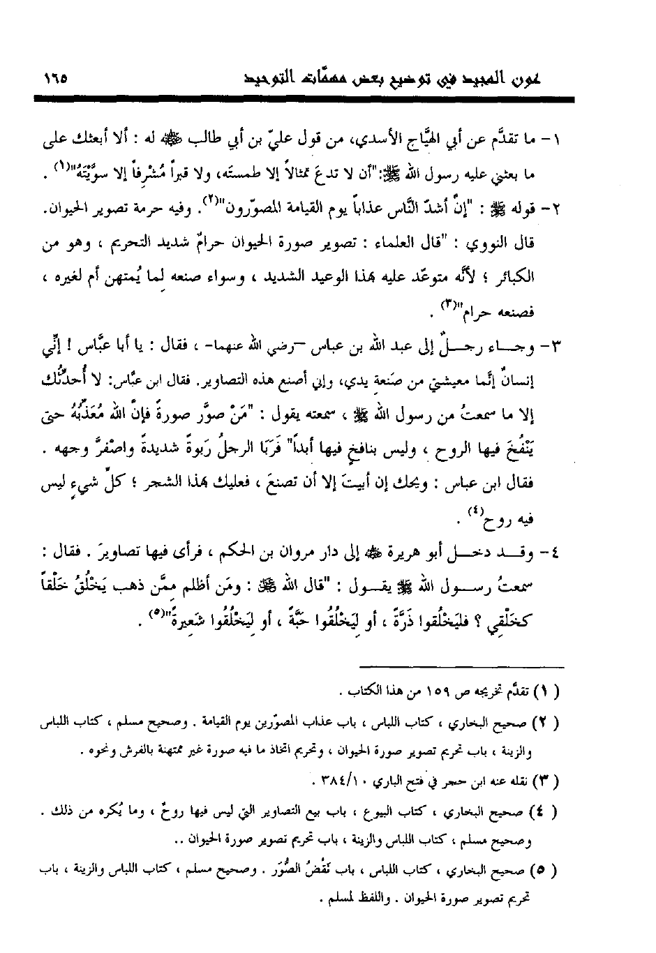 5 صحيح البخاري، كتاب اللباس، باب نقض الصور. وصحيح مسلم، كتاب اللباس والزينة، باب تحريم تصوير صورة الحيوان. واللفظ لمسلم.