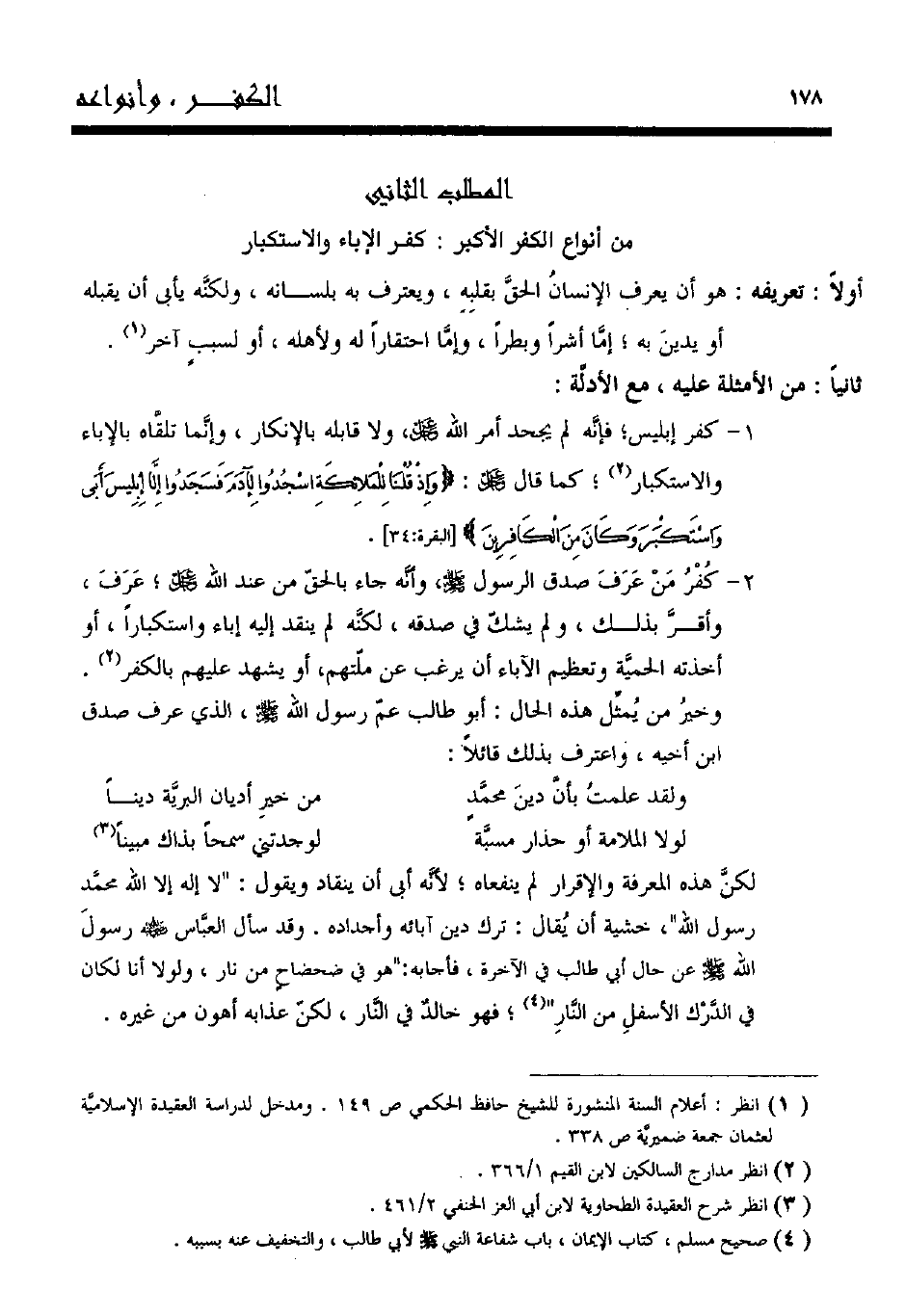 2- كفر من عرف صدق الرسول صلى الله عليه وسلم، وأنه جاء بالحق من عند الله عز وجل؛ عرف، وأقر بذلك، ولم يشك في صدقه؛ لكنه لم ينقد إليه إباء واستكبارا، أو أخذته الحمية وتعظيم الآباء أن يرغب عن ملتهم، أو يشهد عليهم بالكفر2.