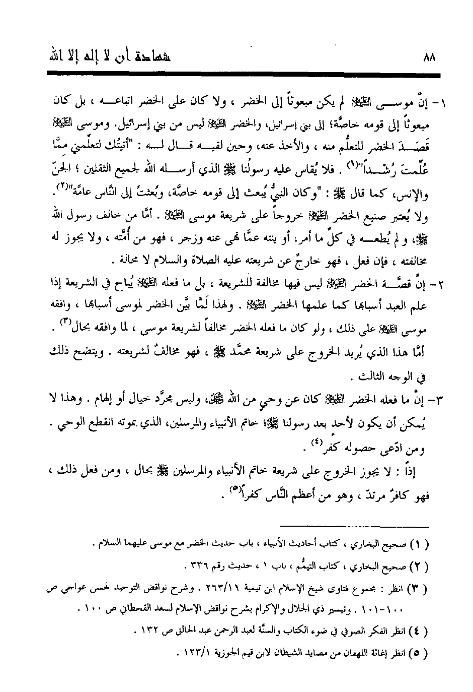 2- إن قصة الخضر عليه السلام ليس فيها مخالفة للشريعة؛ بل ما فعله عليه السلام يباح في الشريعة إذا علم العبد أسبابها كما علمها الخضر عليه السلام. ولهذا لما بين الخضر لموسى أسبابها، وافقه موسى عليه السلام على ذلك، ولو كان ما فعله الخضر مخالفا لشريعة موسى، لما وافقه بحال3.