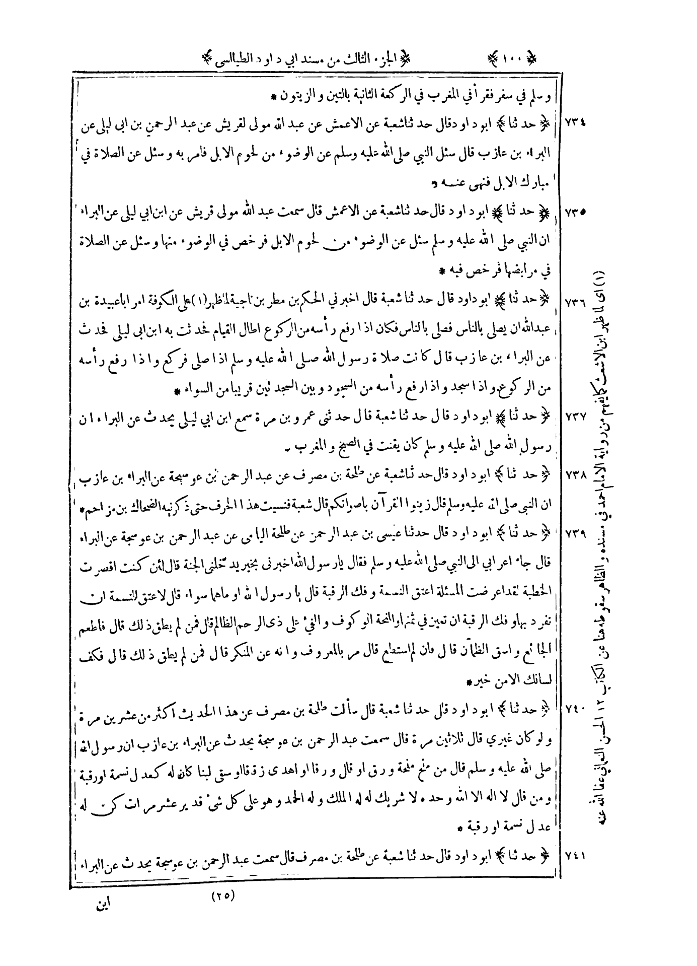 735 - حدثنا أبو داود قال حدثنا شعبة عن الأعمش قال سمعت عبد الله مولى قريش عن بن أبي ليلى عن البراء : أن النبي صلى الله عليه و سلم سئل عن الوضوء من لحوم الإبل فرخص في الوضوء منها وسئل عن الصلاة في مرابضها فرخص فيه