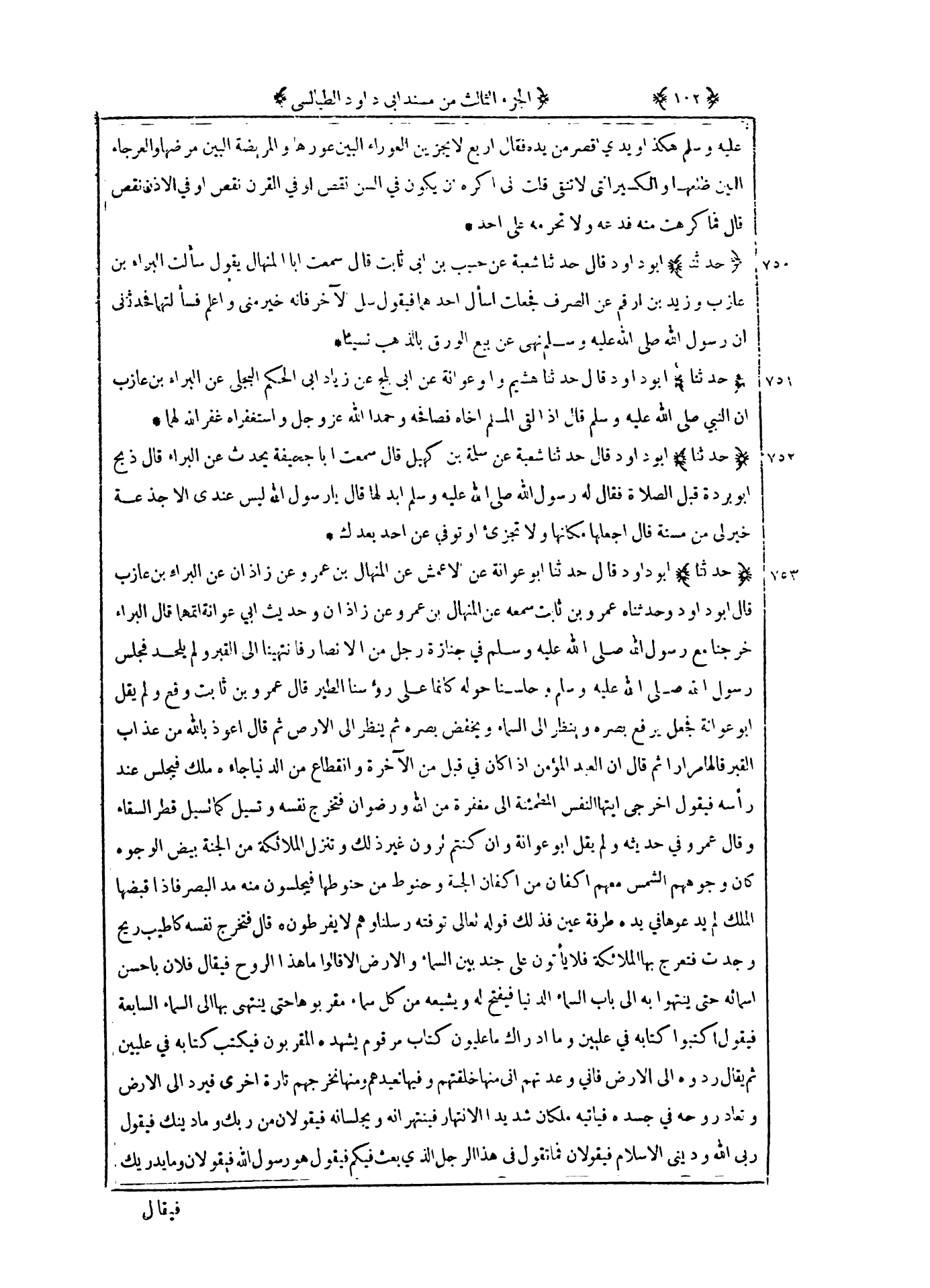 753 - حدثنا أبو داود قال حدثنا أبو عوانة عن الأعمش عن المنهال بن عمرو عن زاذان عن البراء بن عازب قال أبو داود وحدثناه عمرو بن ثابت سمعه عن المنهال بن عمرو عن زاذان وحديث أبي عوانة أتمهما قال البراء : خرجنا مع رسول الله صلى الله عليه و سلم في جنازة رجل من الأنصار فاتهينا إلى القبر ولم يلحد فجلس رسول الله صلى الله عليه و سلم وجلسنا حوله كأنما على رؤوسنا الطير قال عمرو بن ثابت وقع ولم يقل أبو عوانة فجعل يرفع بصره وينظر إلى السماء ويخفض بصره ثم ينظر إلى الأرض ثم قال أعوذ بالله من عذاب القبر قالها مرارا ثم قال إن العبد المؤمن إذا كان في قبل من الآخرة وانقطاع من الدنيا جاءه ملك فيجلس عند رأسه فيقول أخرجي أيتها النفس المطمئنة إلى مغفرة من الله ورضوان فتخرج نفسه وتسيل كما تسيل قطر السقاء وقال عمرو في حديثه ولم يقل أبو عوانة وإن كنتم ترون غير ذلك وتنزل الملائكة من الجنة بيض الوجوه كأن وجوههم الشمس معهم أكفان من أكفان الجنة وحنوط من حنوطها فيجلسون منه مد البصر فإذا قبضها الملك لم يدعوها في يده طرفة عين فذلك قوله تعالى توفته رسلنا وهم لا يفرطون قال فتخرج نفسه كأطيب ريح وجدت فتعرج بها الملائكة فلا يأتون على جند بين السماء والأرض إلا قالوا ما هذا الروح فيقال فلان بأحسن أسمائه حتى ينتهوا به إلى باب السماء الدنيا فيفتح له ويشيعه من كل سماء مقربوها حتى ينتهي بها إلى السماء السابعة فيقول اكتبوا كتابه في عليين وما أدراك ما عليون كتاب مرقوم يشهده المقربون فيكتب كتابه في عليين ثم يقال ردوه إلى الأرض فإني وعدتهم أني منها خلقتهم وفيها نعيدهم ومنها نخرجهم تارة أخرى فيرد إلى الأرض وتعاد روحه في جسده فيأتيه ملكان شديدا الانتهار فينتهرانه ويجلسانه فيقولان من ربك وما دينك فيقول ربي الله وديني الإسلام فيقولان فما تقول في هذا الرجل الذي بعث فيكم فيقول هو رسول الله فيقولان وما يدريك فيقول جاءنا بالبينات من ربنا فآمنت به وصدقته قال وذلك قوله عز و جل يثبت الله الذين آمنوا بالقول الثابت في الحياة الدنيا وفي الآخرة قال وينادي مناد من السماء أن قد صدق عبدي فألبسوه من الجنة وافرشوه منها وأروه منزله منها فيلبس من الجنة ويفرش منها ويرى منزله منها ويفتح له مد بصره ويمثل له عمله في صورة رجل حسن الوجه طيب الريح حسن الثياب فيقول أبشر بما أعده الله عز و جل لك أبشر برضوان الله وجنات فيها نعيم مقيم فيقول بشرك الله بخير من أنت فوجهك الوجه الحسن الذي جاء بالخير فيقول هذا يومك الذي كنت توعد والأمر الذي كنت توعد أنا عملك الصالح فوالله ما علمتك إلا كنت سريعا في طاعة الله بطيئا في معصية الله فجزاك الله خيرا فيقول يا رب أقم الساعة كي أرجع إلى أهلي ومالي قال وإن كان فاجرا فكان في قبل من الآخرة وانقطاع من الدنيا جاءه ملك فيجلس عند رأسه فيقول أخرجي أيتها النفس الخبيثة أبشري بسخط من الله وغضبه فتنزل ملائكة سود الوجوه معهم مسوح فإذا قبضها الملك قاموا فلم يدعوها في يده طرفة عين قال فتفرق في جسده فيستخرجها يقطع معها العروق والعصب كالسفود الكثير الشعب في الصوف المبلول فيؤخذ من الملك فيخرج كأنتن ريح وجدت فلا يمر على جند فيما بين السماء والأرض إلا قالوا ما هذا الروح الخبيث فيقولون هذا فلان بأسوأ أسمائه حتى ينتهوا إلى السماء الدنيا فيقول ردوه إلى الأرض إني وعدتهم أني منها خلقتهم وفيها نعيدهم ومنها نخرجهم تارة أخرى قال فيرمى به من السماء قال فتلا هذه الآية { ومن يشرك بالله فكأنما خر من السماء } الآية قال ويعاد إلى الأرض وتعاد فيه روحه ويأتيه ملكان شديدا الانتهار فينتهرانه ويجلسانه فيقولان من ربك وما دينك فيقول لا أدري فيقولان فما تقول في هذا الرجل الذي بعث فيكم فلا يهتدي لاسمه فيقول لا أدري سمعت الناس يقولون ذاك قال فيقال لا دريت فيضيق عليه قبره حتى تختلف أضلاعه ويمثل له عمله في صورة رجل قبيح الوجه منتن الريح قبيح الثياب فيقول أبشر بعذاب من الله وسخطه فيقول من أنت فوجهك الذي جاء بالشر فيقول أنا عملك الخبيث والله ما علمتك إلا كنت ب