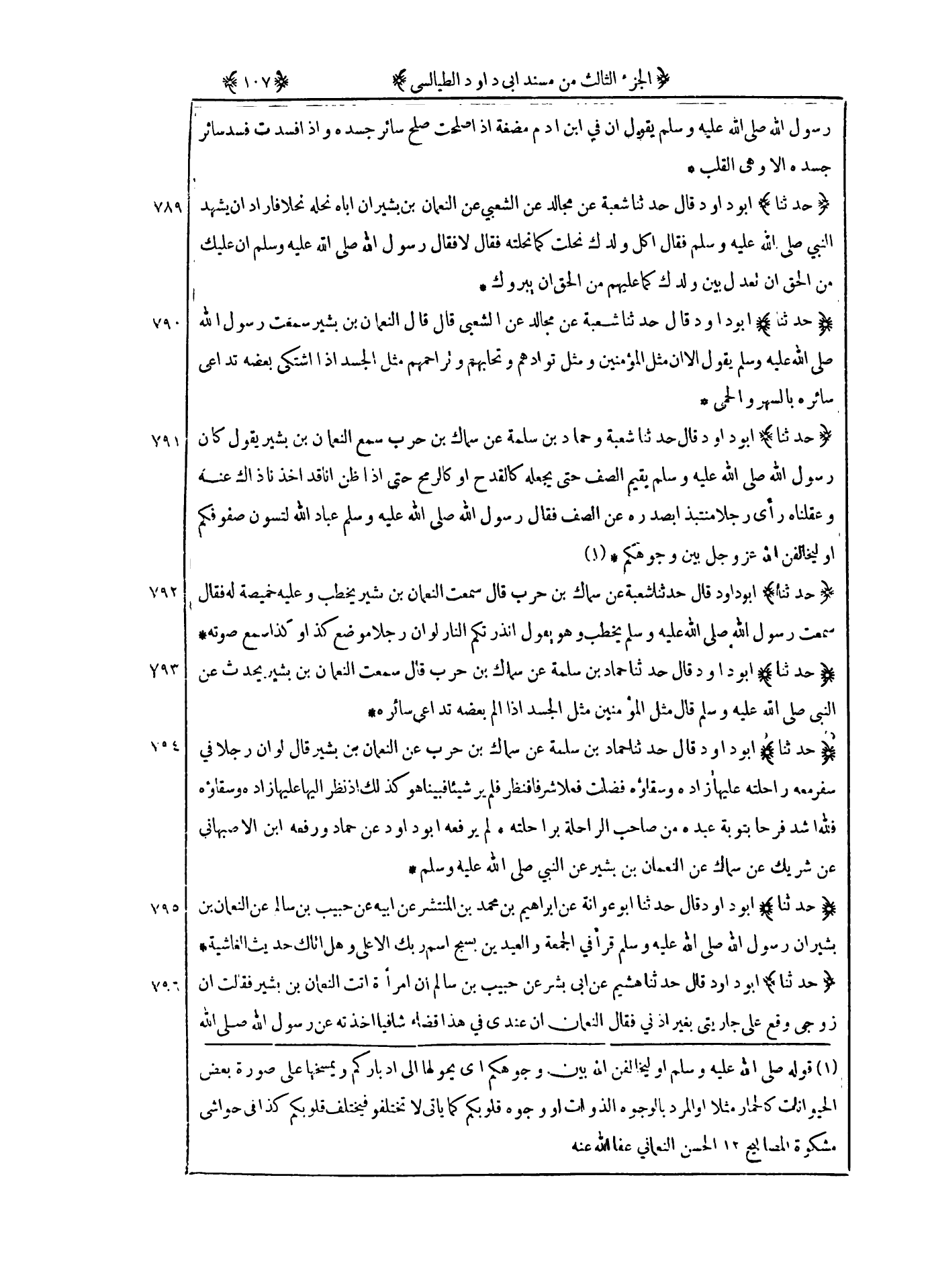 790 - حدثنا أبو داود قال حدثنا شعبة عن مجالد عن الشعبي قال قال النعمان بن بشير سمعت رسول الله صلى الله عليه و سلم يقول : ألا إن مثل المؤمنين ومثل توادهم وتحابهم وتراحمهم مثل الجسد إذا اشتكى بعضه تداعى سائره بالسهر والحمى