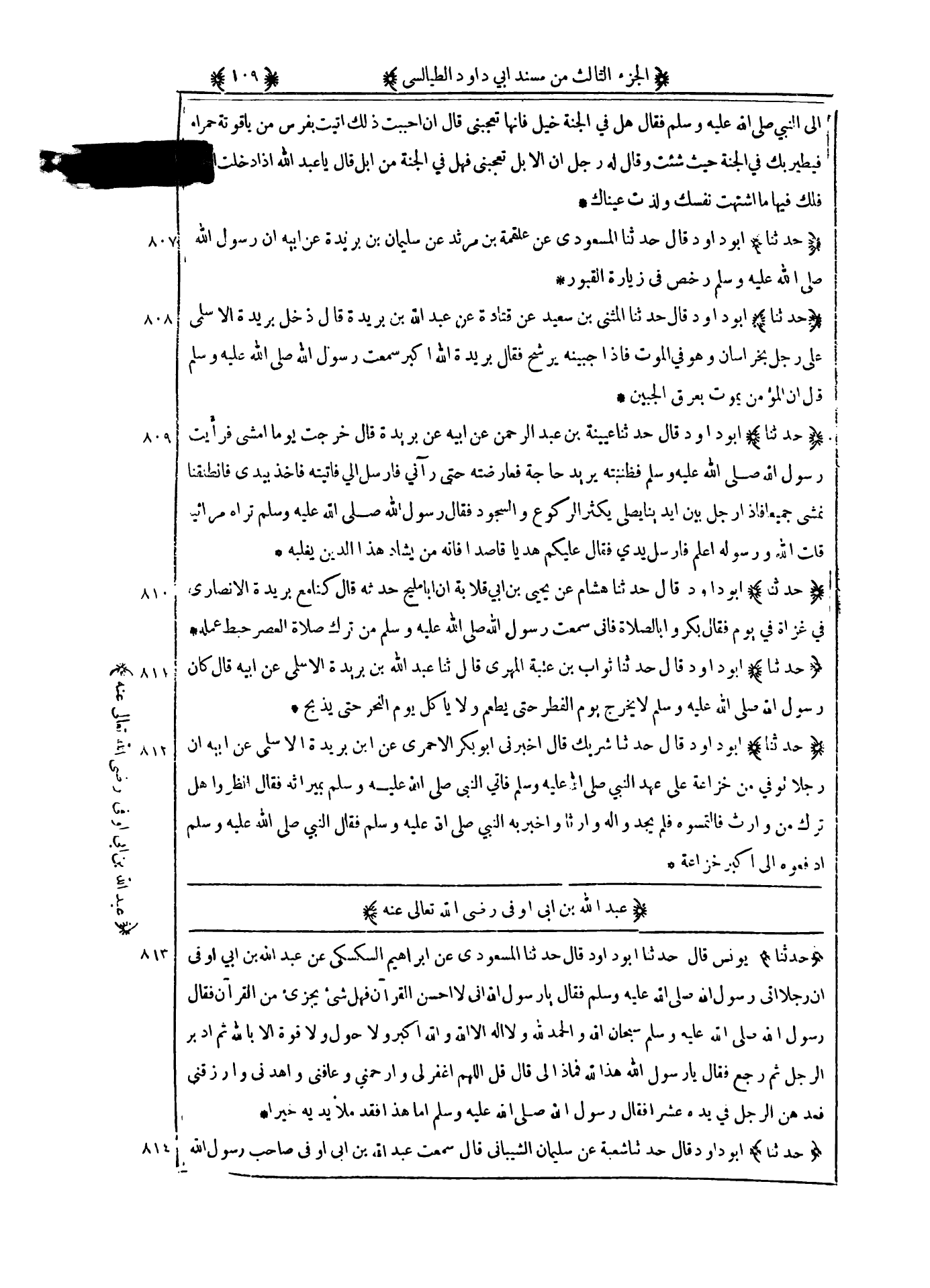 808 - حدثنا أبو داود قال حدثنا المثنى بن سعيد عن قتادة عن عبد الله بن بريدة قال دخل بريدة الأسلمي على رجل بخراسان وهو في الموت فإذا جبينه يرشح فقال بريدة الله أكبر سمعت رسول الله صلى الله عليه و سلم قال : إن المؤمن يموت بعرق الجبين