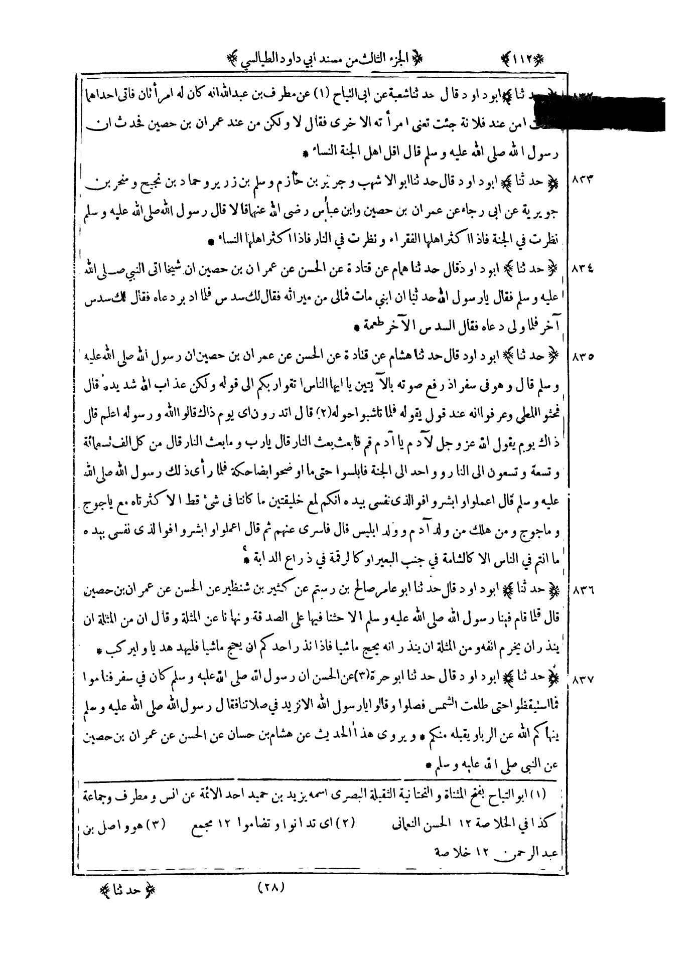 833 - حدثنا أبو داود قال حدثنا أبو الأشهب وجرير بن حازم وسلم بن زرير وحماد بن نجيح ومنحر بن جويرية عن أبي رجاء عن عمران بن حصين وابن عباس رضي الله عنهما قالا قال رسول الله صلى الله عليه و سلم : نظرت في الجنة فإذا أكثر أهلها الفقراء ونظرت في النار فإذا أكثر أهلها النساء