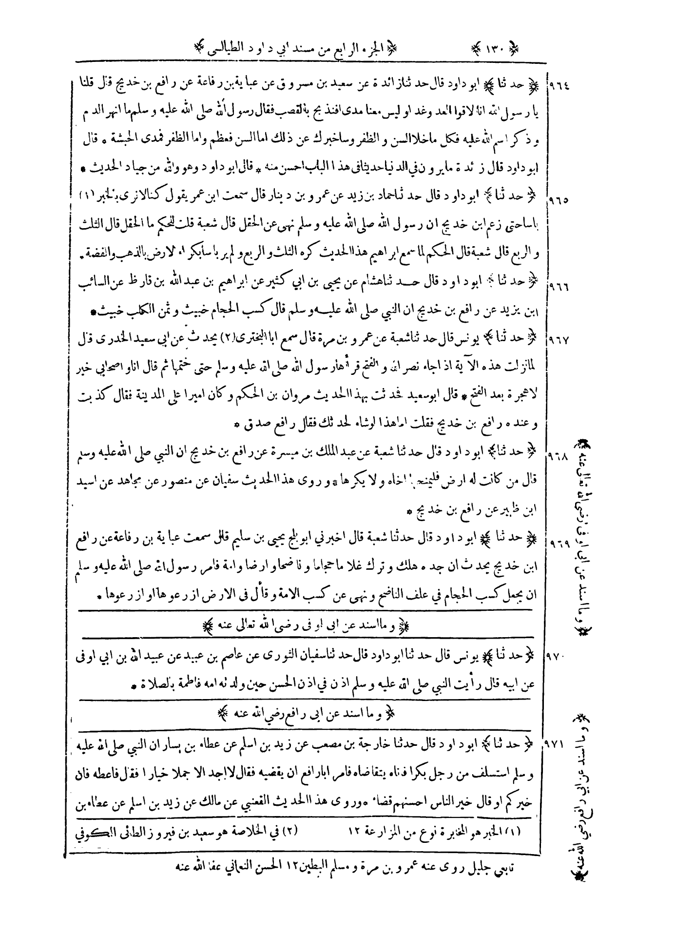 969 - حدثنا أبو داود قال حدثنا شعبة قال أخبرني أبو بلج بن سليم قال سمعت عباية بن رفاعة عن رافع ان خديج يحدث : ان جده هلك وترك غلاما حجاما وناضحا وارضا وأمه فأمر رسول الله صلى الله عليه و سلم ان يجعل كسب الحجام في علف الناضح ونهى عن كسب الأمة وقال في الأرض ازرعوها أو ازرعوها