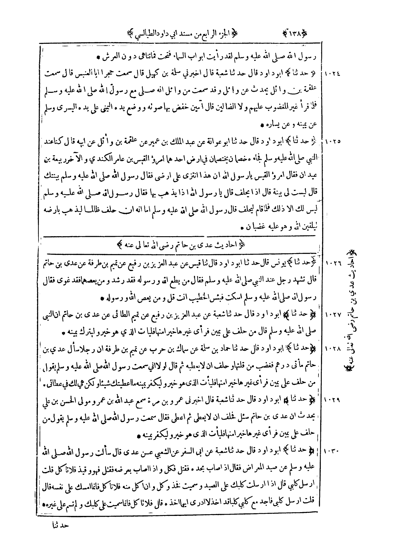 1030 - حدثنا أبو داود قال حدثنا شعبة عن أبي السفر عن الشعبي عن عدي قال : سألت رسول الله صلى الله عليه و سلم عن صيد المعراض فقال إذا أصاب بحده فقتل فكل وإذا أصاب بعرضه فقتل فهو وقيذ فلانا كل قلت أرسل كلبى قال إذا أرسلت كلبك على الصيد وسميت فخذ وكل وان أكل منه فلا تأكل فإنما امسك على نفسه قال قلت أرسل كلبي فأجد مع كلبى كلبا قد أخذ لا أدري أيهما اخذه قال فلانا كل فإنما سميت على كلبك ولم تسم على غيره حدثنا أبو داود قال حدثنا شعبة عن الحكم عن الشعبي عن عدى قال قلت يا رسول الله أرسل كلبى علي الصيد فذكر نحوه