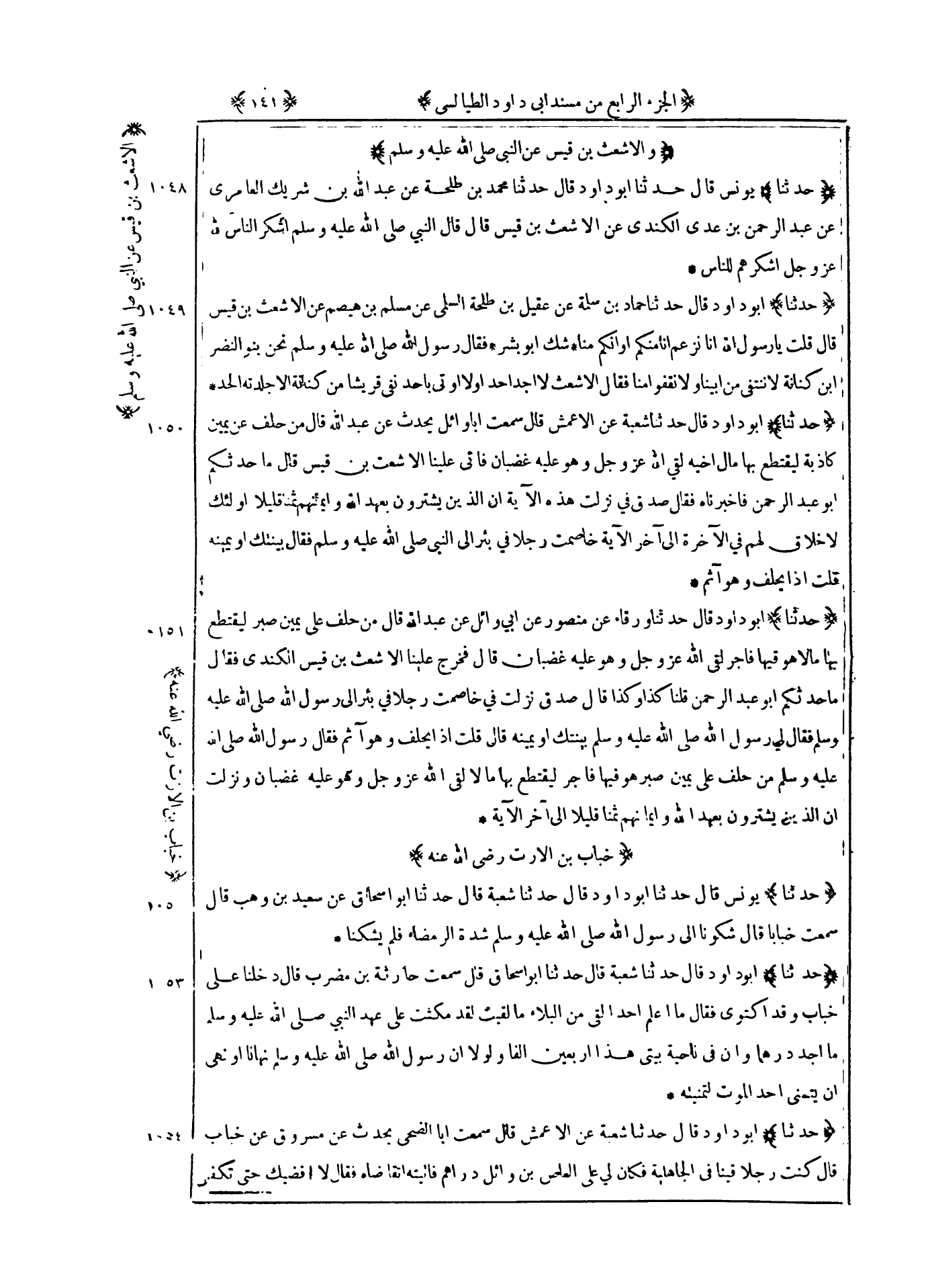 1051 - حدثنا أبو داود قال حدثنا ورقاء عن منصور عن أبي وائل عن عبد الله قال : من حلف على يمين صبر ليقتطع بها مالا هو فيها فاجر لقي الله عز و جل وهو عليه غضبان قال فخرج علينا الأشعث بن قيس الكندي فقال ما حدثكم أبو عبد الرحمن قلنا كذا وكذا قال صدق نزلت في خاصمت رجلا في بئر الى رسول الله صلى الله عليه و سلم فقال لي رسول الله صلى الله عليه و سلم بينتك أو يمينه قال قلت إذا يحلف وهو آثم فقال رسول الله صلى الله عليه و سلم من حلف علي يمين صبر هو فيها فاجر ليقتطع بها مالا لقى الله عز و جل وهو عليه غضبان ونزلت ان الذين يشترون بعهد الله وايمانهم ثمنا قليلا الى آخر الآية
