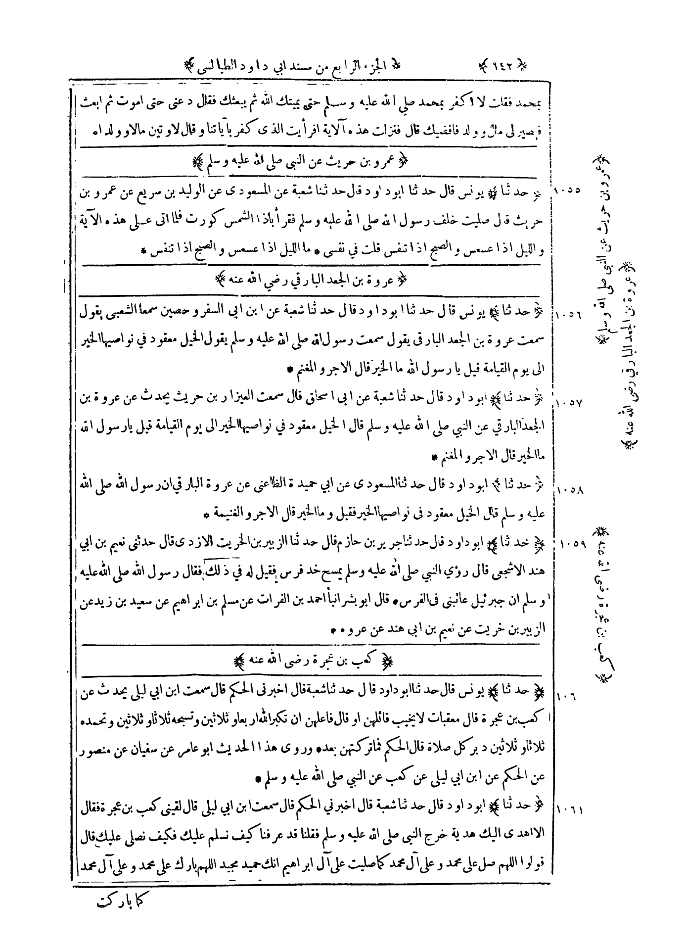 1057 - حدثنا أبو داود قال حدثنا شعبة عن أبي إسحاق قال سمعت العيزار بن حريث يحدث عن عروة بن الجعد البارقي عن النبي صلى الله عليه و سلم قال : الخيل معقود في نواصيها الخير الى يوم القيامة قيل يا رسول الله ما الخير قال الأجر والمغنم
