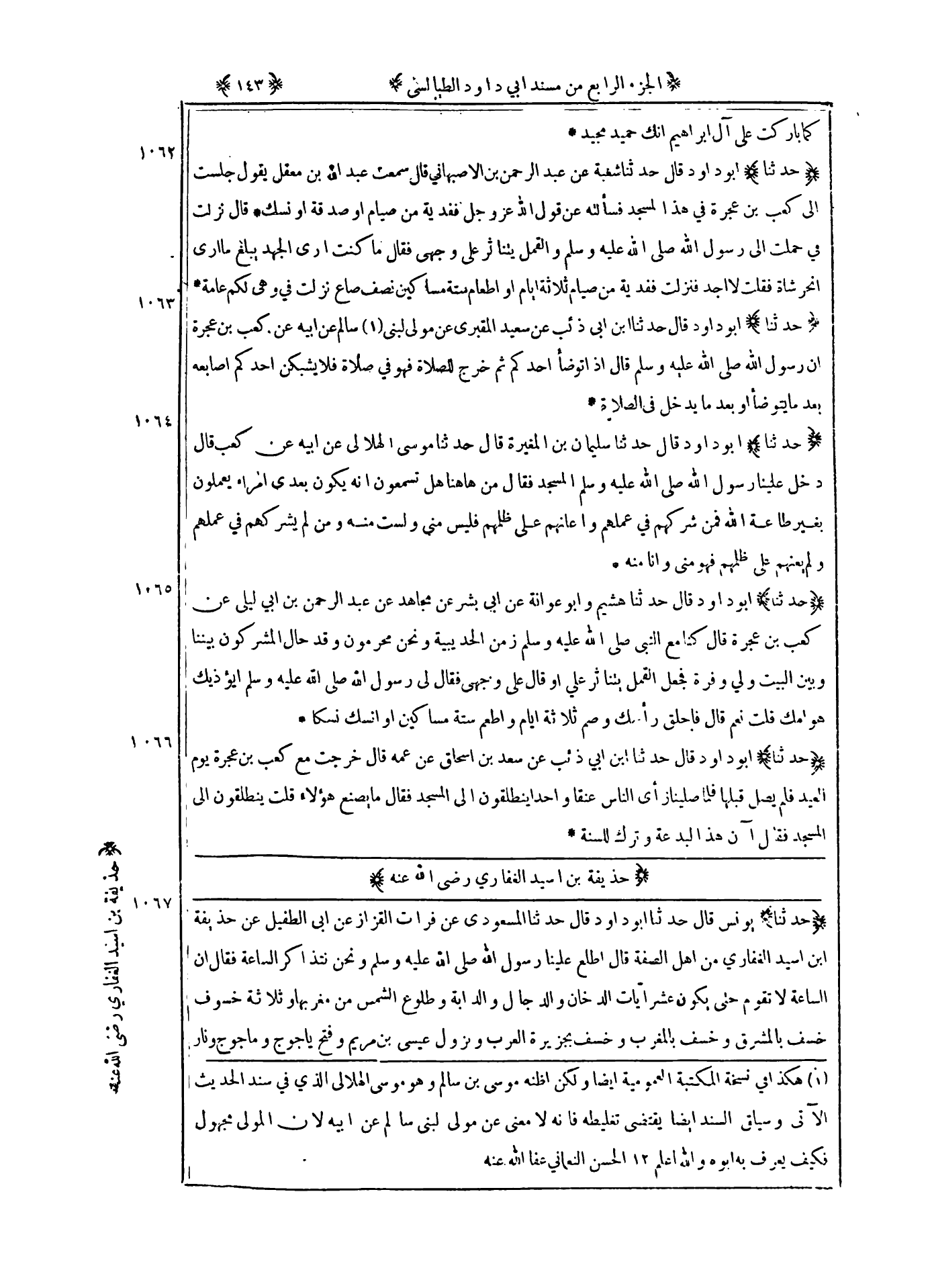 1066 - حدثنا أبو داود قال حدثنا بن أبي ذئب عن سعد بن إسحاق عن عمه قال : خرجت مع كعب بن عجرة يوم العيد فلم يصل قبلها فلما صلينا رأى الناس عنقا واحدا ينطلقون الى المسجد فقال ما يصنع هؤلاء قلت ينطلقون الى المسجد فقال ان هذه البدعة وترك للسنة