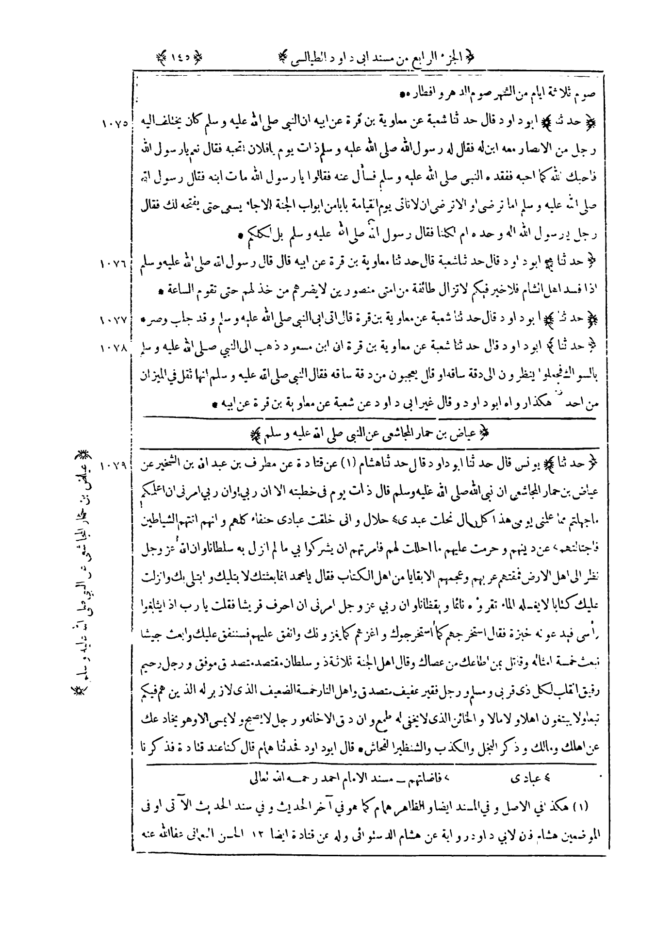 1078 - حدثنا أبو داود قال حدثنا شعبة عن معاوية بن قرة : ان بن مسعود ذهب الى النبي صلى الله عليه و سلم بالسواك فجعلوا ينظرون الى دقة ساقه أو قال يعجبون من دقة ساقه فقال النبي صلى الله عليه و سلم انها ثقل في الميزان من أحد هكذا رواه أبو داود وقال غير أبي داود عن شعبة عن معاوية بن قرة عن أبيه