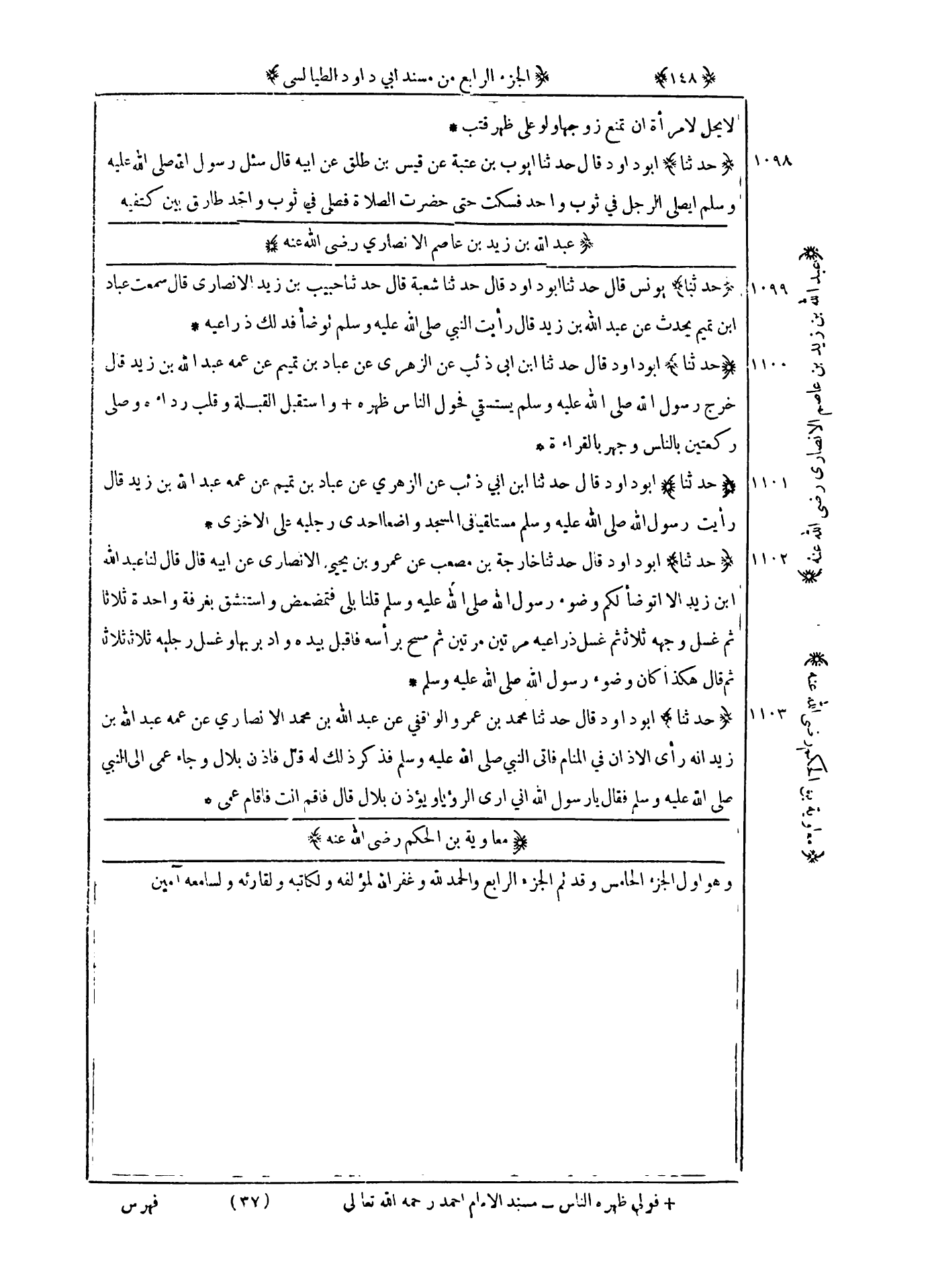 1103 - حدثنا أبو داود قال حدثنا محمد بن عمرو الواقفي عن عبد الله بن محمد الأنصاري عن عمه عبد الله بن زيد : انه رأى الأذان في المنام فأتى النبي صلى الله عليه و سلم فذكر له قال فأذن بلال وجاء عمى الى النبي صلى الله عليه و سلم فقال يا رسول الله اني أرى الرؤيا ويؤذن بلال قال فأقم أنت فأقام عمى [ ص 149 ] [ ص 150 ] بسم الله الرحمن الرحيم أخبرنا القاضى أبو المكارم أحمد بن محمد بن عبد الله المعدل قراءة عليه وانا اسمع بأصبهان قيل له أخبركم أبو علي الحسن بن أحمد بن الحسن الحداد المقري قراءة عليه وأنت تسمع في محرم سنة اثنتي عشرة وخمسمائة فأقربه قال أخبرنا الامام أبو نعيم أحمد بن عبد الله بن أحمد بن إسحاق الحافظ قال حدثنا أبو محمد عبد الله بن جعفر بن أحمد بن فارس قال حدثنا أبو بشر يونس بن حبيب بن عبد القاهر العجلي قال حدثنا أبو داود الطيالسي قال