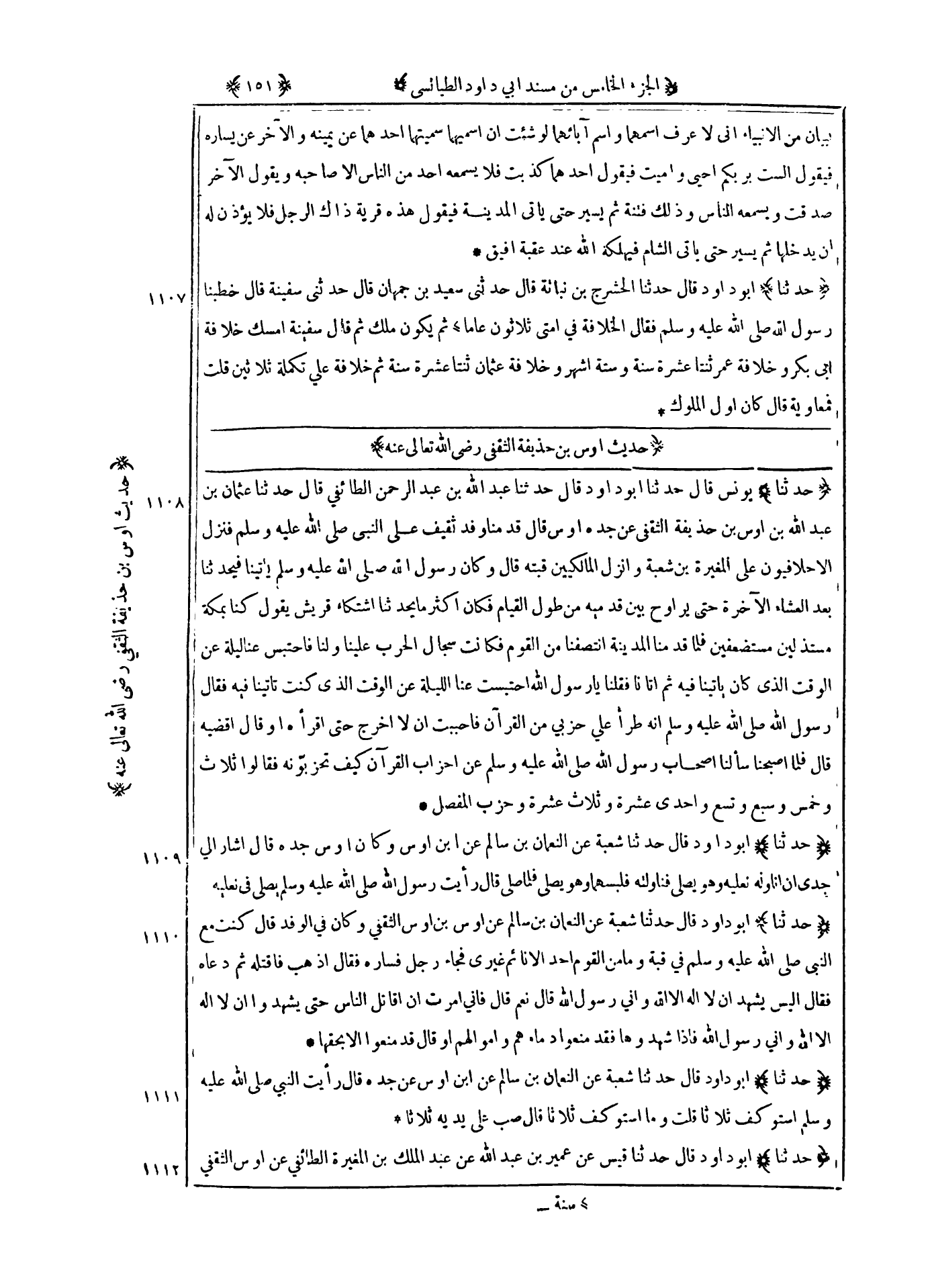 1112 - حدثنا أبو داود قال حدثنا قيس عن عمير بن عبد الله عن عبد الملك بن المغيرة الطائفي عن أوس الثقفي قال : قدمنا على النبي صلى الله عليه و سلم في وفد ثقيف فاقمنا عنده نصف شهر فرأيته ينفتل عن يمينه وعن يساره