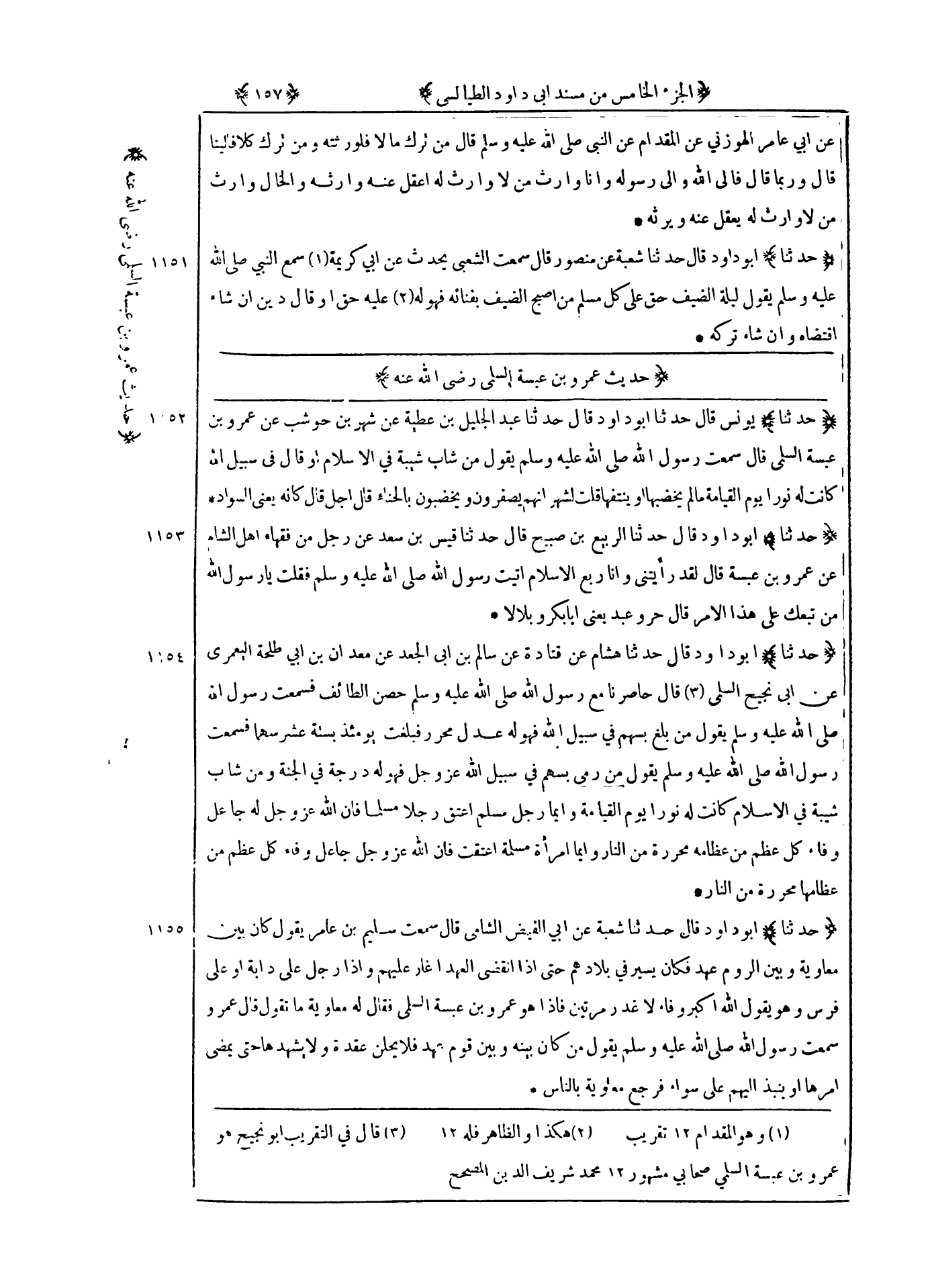 1153 - حدثنا أبو داود قال حدثنا الربيع بن صبيح قال حدثنا قيس بن سعد عن رجل من فقهاء أهل الشام عن عمرو بن عبسة قال : لقد رأيتني وانا ربع الإسلام أتيت رسول الله صلى الله عليه و سلم فقلت يا رسول الله من تبعك على هذا الأمر قال حر وعبد يعنى أبا بكر وبلالا
