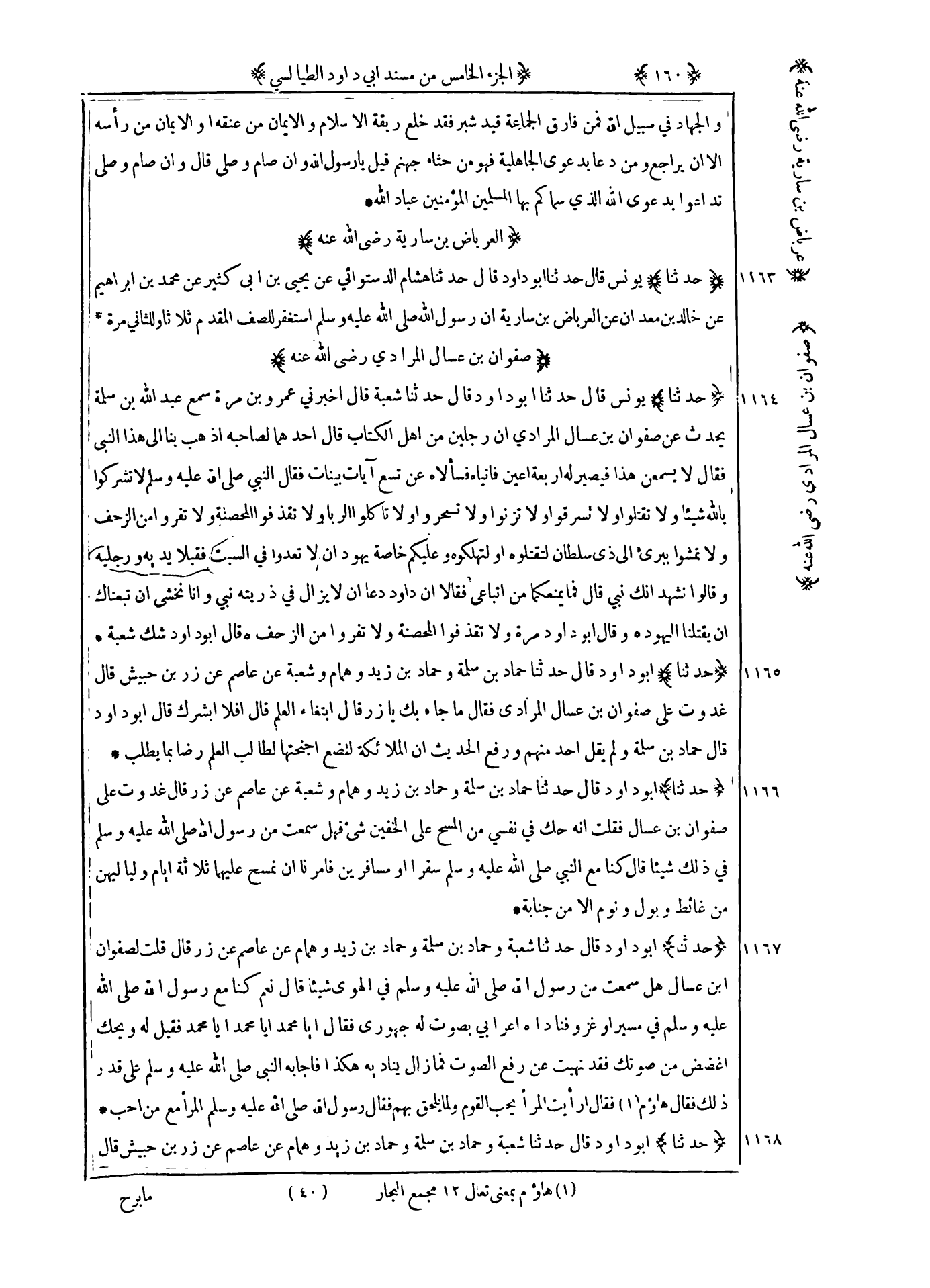 1163 - حدثنا يونس قال حدثنا أبو داود قال حدثنا هشام الدستوائي عن يحيى بن أبي كثير عن محمد بن إبراهيم عن خالد بن معدان عن العرباض بن سارية : ان رسول الله صلى الله عليه و سلم استغفر للصف المقدم ثلاثا والثاني مرة