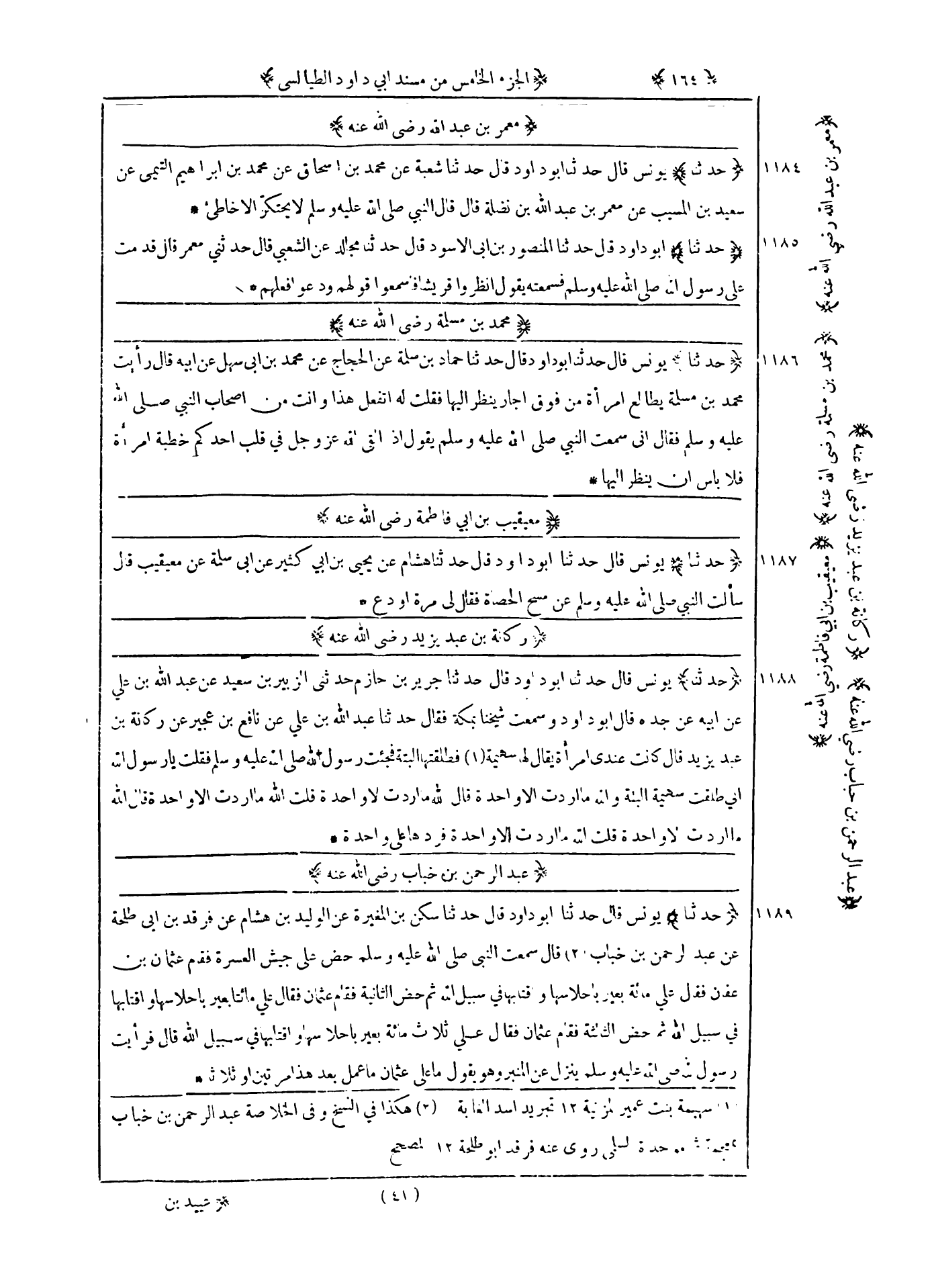 1189 - حدثنا يونس قال حدثنا أبو داود قال حدثنا سكن بن المغيرة عن الوليد بن هشام عن فرقد بن أبي طلحة عن عبد الرحمن بن خباب قال : سمعت النبي صلى الله عليه و سلم حض على جيش العسرة فقام عثمان بن عفان فقال علي مائة بعير بأحلاسها وأقتابها في سبيل الله ثم حض الثانية فقال عثمان فقال علي مائتان بعير بأحلاسها واقتابها في سبيل الله ثم حض الثالثة فقام عثمان فقال علي ثلاث مائة بعير بأحلاسها واقتابها في سبيل الله قال فرأيت رسول الله صلى الله عليه و سلم ينزل عن المنبر وهو يقول ما على عثمان ما عمل بعد هذا مرتين أو ثلاثا