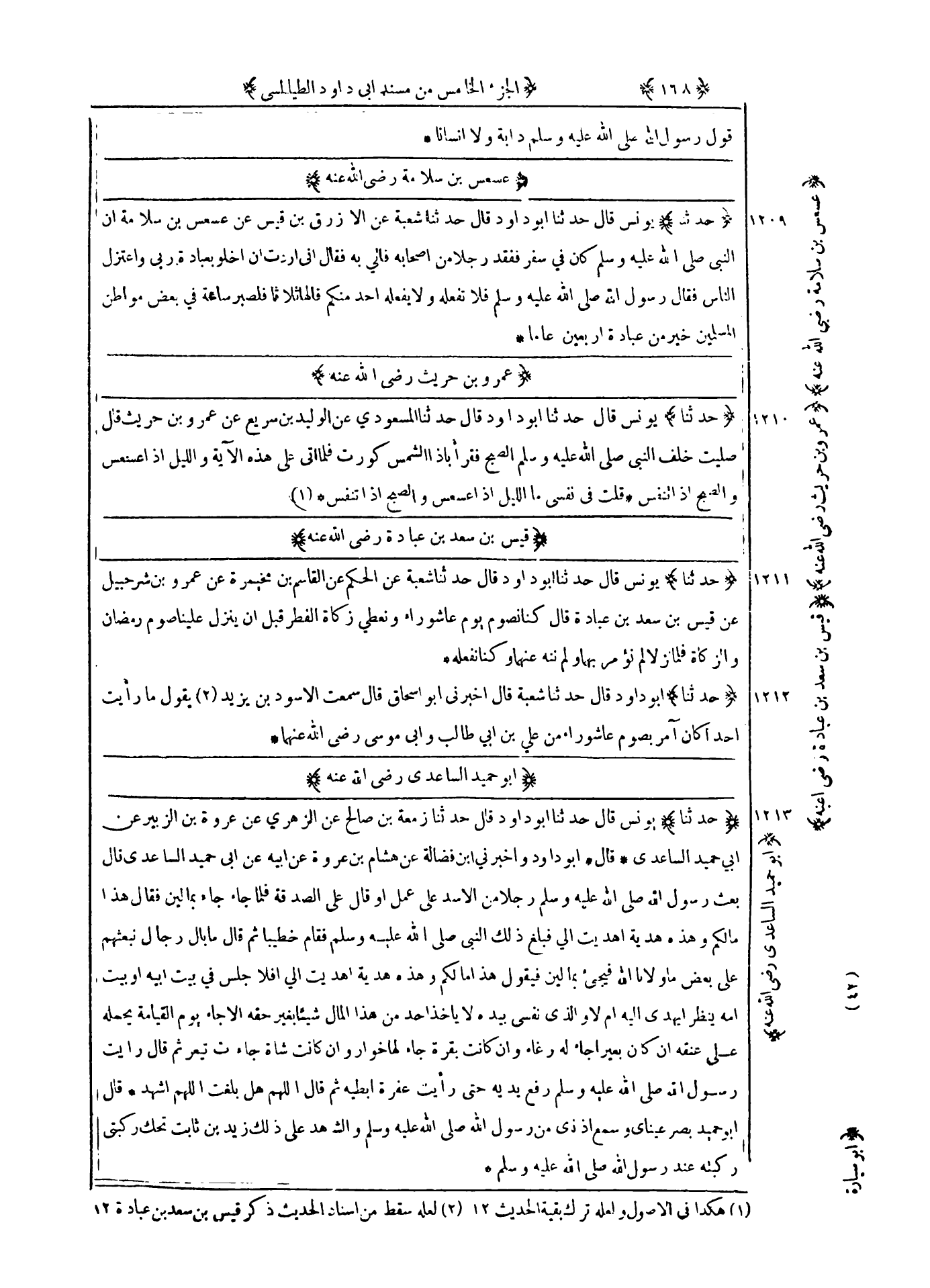 1209 - حدثنا يونس قال حدثنا أبو داود قال حدثنا شعبة عن الأزرق بن قيس عن عسعس بن سلامة : ان النبي صلى الله عليه و سلم كان في سفر ففقد رجلا من اصحابه فأتي به فقال اني أردت ان أخلو بعبادة ربي واعتزل الناس فقال رسول الله صلى الله عليه و سلم فلا تفعله ولا يفعله أحد منكم قالها ثلاثا فلصبر ساعة في بعض مواطن المسليمن خير من عبادة أربعين عاما