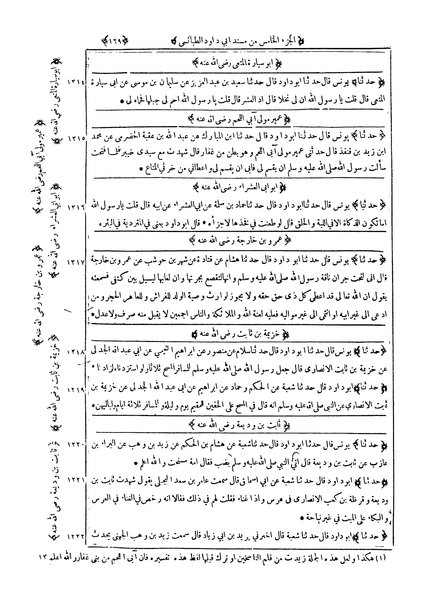 1215 - حدثنا يونس قال حدثنا أبو داود قال حدثنا بن المبارك عن عبد الله بن عقبة الحضرمي عن محمد بن زيد بن قنفذ قال حدثني عمير مولى آبي اللحم وهو بطن من غفار قال : شهدت مع سيدي خيبر فلما فتحت سألت رسول الله صلى الله عليه و سلم ان يقسم لي فأبى ان يقسم لي واعطانى من خرثي المتاع