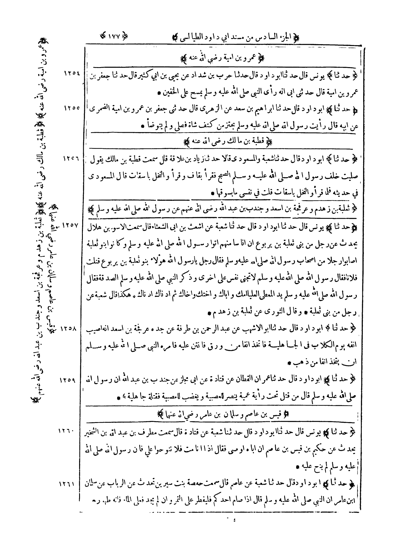 1257 - حدثنا يونس قال حدثنا أبو داود قال حدثنا شعبة عن أشعث بن أبي الشعثاء قال سمعت الأسود بن هلال يحدث عن رجل من بنى ثعلبة بن يربوع : ان أناسا منهم اتوا رسول الله صلى الله عليه و سلم وكانوا بنو ثعلبة أصابوا رجلا من أصحاب رسول الله صلى الله عليه و سلم فقال رجل يا رسول الله هؤلاء بنو ثعلبة يربوع قتلت فلانا فقال رسول الله صلى الله عليه و سلم لا تجنى نفس على أخرى وذكر النبي صلى الله عليه و سلم الصدقة فقال رسول الله صلى الله عليه و سلم يد المعطى العليا أمك وأباك واختك واخاك ثم ادناك ادناك هكذا قال شعبة عن رجل من بنى ثعلبة وقال الثوري عن ثعلبة بن زهدم