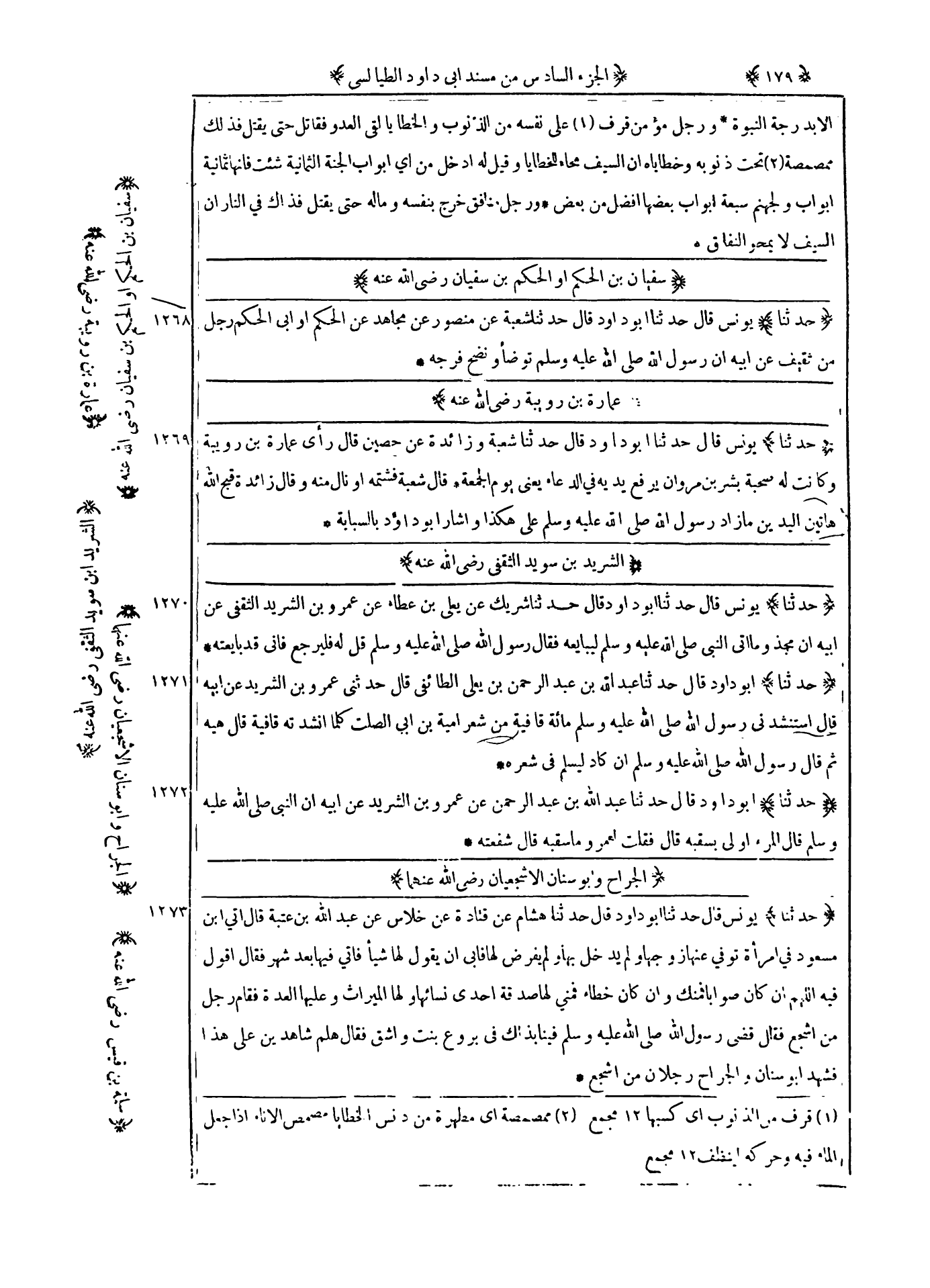 1269 - حدثنا يونس قال حدثنا أبو داود قال حدثنا شعبة وزائدة عن حصين قال : رأى عمارة بن رويبة وكانت له صحبة بشر بن مروان يرفع يديه في الدعاء يعنى يوم الجمعة قال شعبة فشتمه أو نال منه وقال زائدة قبح الله هاتين اليدين ما زاد رسول الله صلى الله عليه و سلم على هكذا وأشار أبو داود بالسبابة