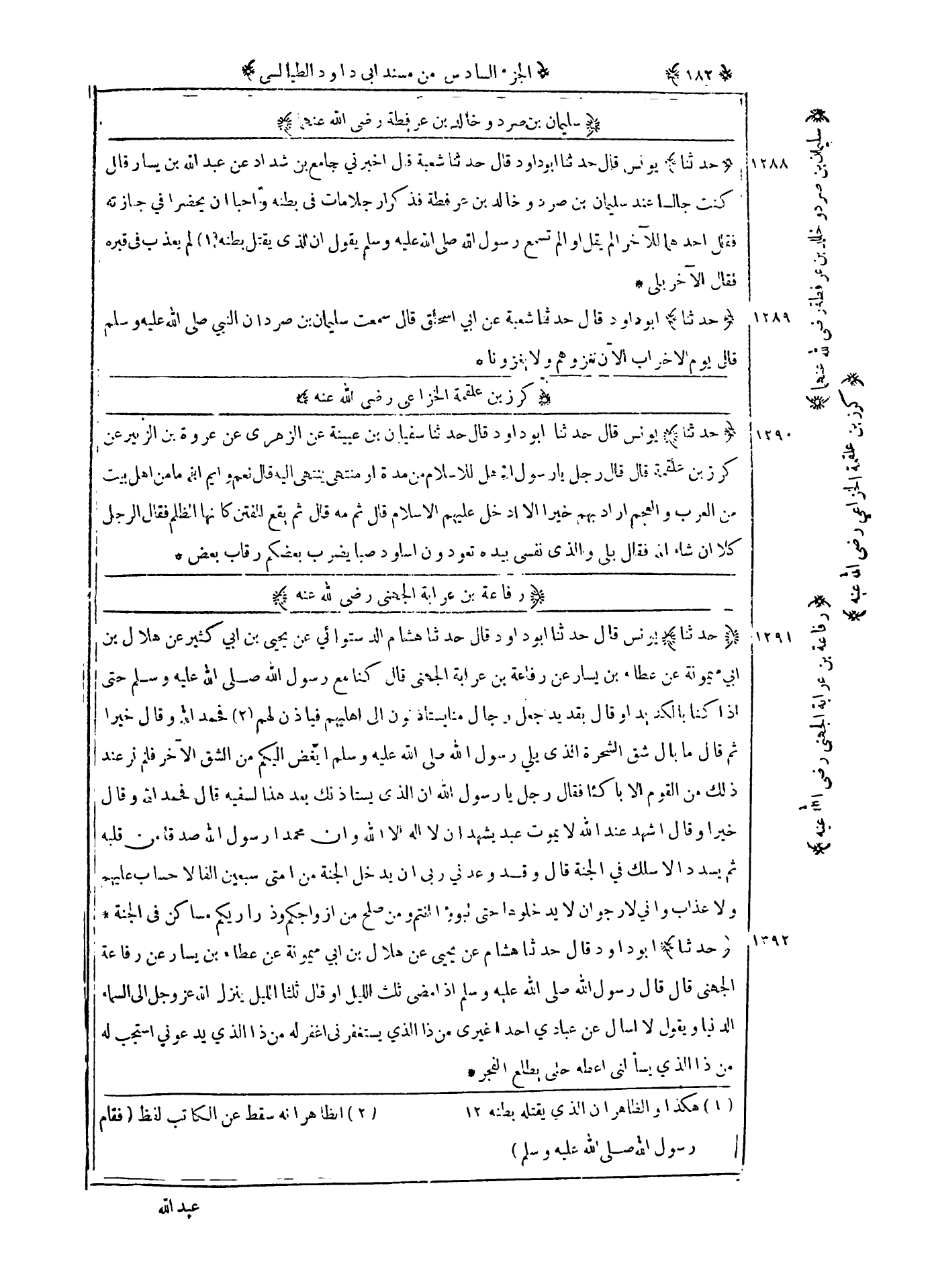 1288 - حدثنا يونس قال حدثنا أبو داود قال حدثنا شعبة قال أخبرني جامع بن شداد عن عبد الله بن يسار قال كنت جالسا عند سليمان بن صرد وخالد بن عرفطة فذكرا رجلا مات في بطنه وأحبا ان يحضرا في جنازته فقال أحدهما للآخر ألم يقل أو لم تسمع رسول الله صلى الله عليه و سلم يقول : أن الذي يقتل بطنه لم يعذب في قبره فقال الآخر بلى