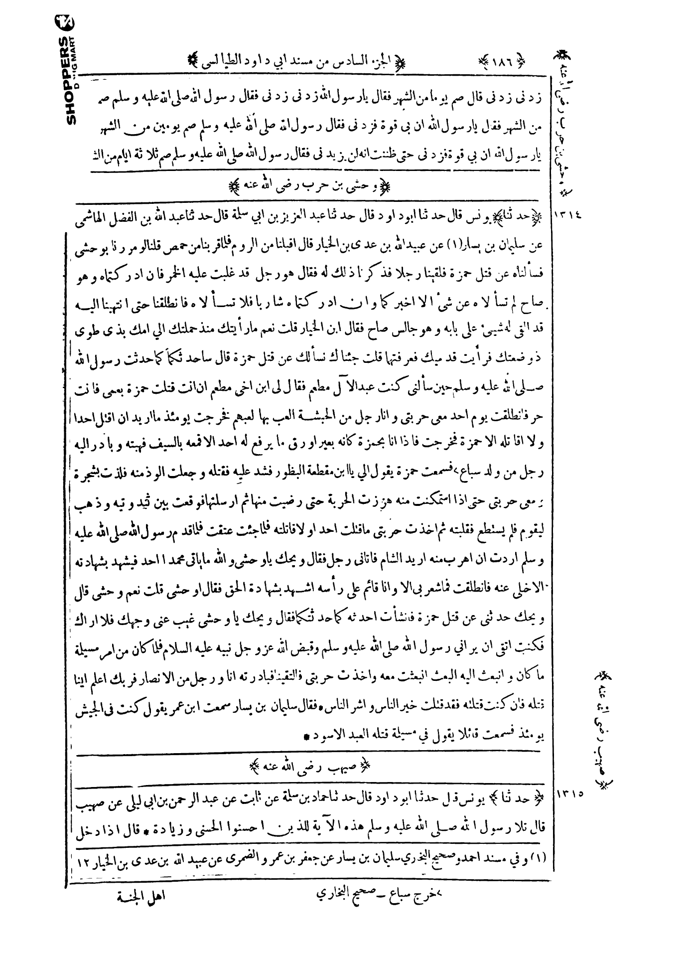 1314 - حدثنا يونس قال حدثنا أبو داود قال حدثنا عبد العزيز بن أبي سلمة قال حدثنا عبد الله بن الفضل الهاشمي عن سليمان بن يسار عن عبيد الله بن عدى بن الخيار قال : اقبلنا من الروم فلما قربنا من حمص قلنا لو مررنا بوحشي فسألناه عن قتل حمزة فلقينا رجلا فذكرنا ذلك له فقال هو رجل قد غلبت عليه الخمر فإن ادركتماه وهو صاح لم تسألاه عن شيء الا اخبركما وان ادركتماه شاربا فلا تسألاه فانطلقنا حتى انتهينا اليه قد ألقى له شيء علي بابه وهو جالس صاح فقال بن الخيار قلت نعم ما رأيتك منذ حملتك الي أمك بذي طوى إذ وضعتك فرأيت قدميك فعرفتهما قلت جئناك نسألك عن قتل حمزة قال سأحدثكما كما حدثت رسول الله صلى الله عليه و سلم حين سألني كنت عبدا لآل مطعم فقال لي بن أخي مطعم ان أنت قتلت حمزة بعمى فأنت حر فانطلقت يوم أحد معي حربتى وانا رجل من الحبشة العب بها لعبهم فخرجت يومئذ ما أريد ان أقتل أحدا ولا أقاتله إلا حمزة فخرجت فإذا أنا بحمزة كأنه بعيرا أورق ما يرفع له أحد إلا قمعه بالسيف فهبته وبادر إليه رجل من ولد سباع فسمعت حمزة يقول الي يا بن مقطعة البظور فشد عليه فقتله وجعلت ألوذ منه فلذت بشجرة ومعي حربتى حتى إذا استكنت منه هززت الحربة حتى رضيت منها ثم ارسلتها فوقعت بين ثندوتيه وذهب ليقوم فلم يستطع فقلبته ثم أخذت حربتى ما قتلت أحدا ولا قاتلته فلما جئت عتقت فلما قدم رسول الله صلى الله عليه و سلم أردت ان اهرب منه أريد الشام فأتاني رجل فقال ويحك يا وحشي والله ما يأتى محمدا أحدا فيشهد بشهادته الا خلى عنه فانطلقت فما شعر بي الا وانا قائم على رأسه اشهد بشهادة الحق فقال اوحشى قلت نعم وحشي قال ويحك حدثني عن قتل حمزة فأنشات أحدثه كما حدثتكما فقال ويحك يا وحشي غيب عنى وجهك فلا أراك فكنت اتقى ان يراني رسول الله صلى الله عليه و سلم وقبض الله عز و جل نبيه عليه السلام فلما كان من أمر مسيلمة ما كان وانبعث اليه البعث انبعثت معه وأخذت حربتى فالتقينا فبادرته انا ورجل من الأنصار فربك اعلم اينا قتله فان كنت قتلته فقد قتلت خير الناس واشر الناس فقال سليمان بن يسار سمعت بن عمر يقول كنت في الجيش يومئذ فسمعت قائلا يقول في مسيلمة قتله العبد الأسود