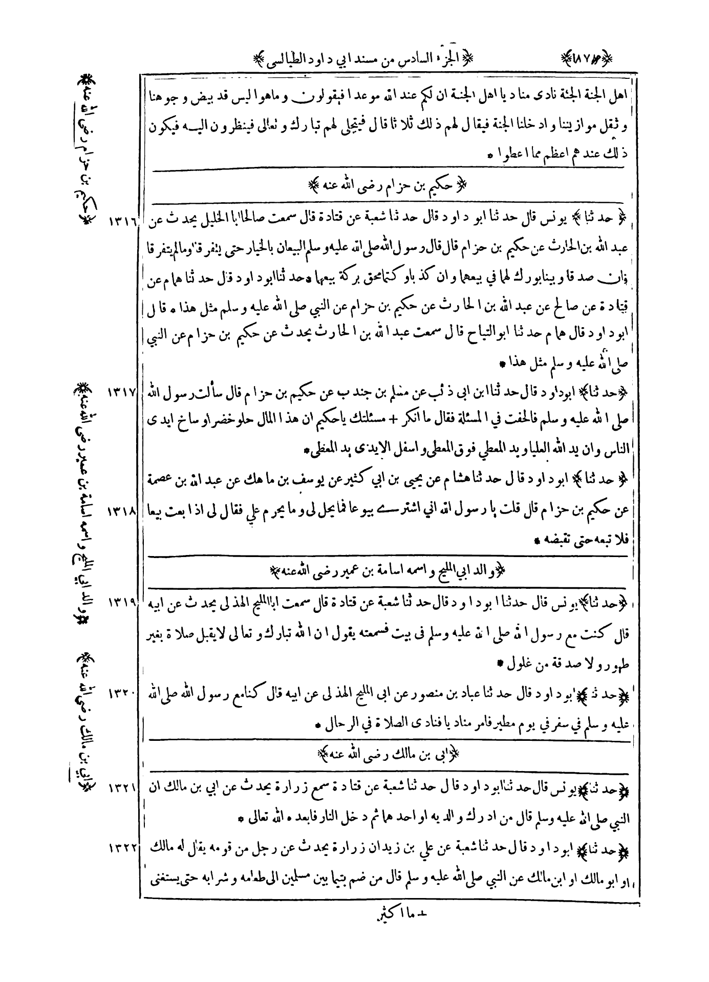 1317 - حدثنا أبو داود قال حدثنا بن أبى ذئب عن مسلم بن جندب عن حكيم بن حزام قال : سألت رسول الله صلى الله عليه و سلم فألحفت في المسئلة فقال ما انكر مسئلتك يا حكيم ان هذا المال حلو خضر أوساخ ايدى الناس وان يد الله العليا ويد المعطي فوق المعطى واسفل الأيدى يد المعطى