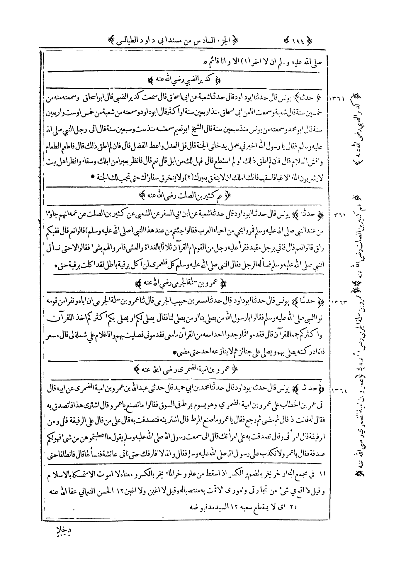 1361 - حدثنا يونس قال حدثنا أبو داود قال حدثنا شعبة عن أبي إسحاق قال سمعت كدير الضبي قال أبو إسحاق وسمعته منه من خمسين سنة قال شعبة وسمعت انا من أبى إسحاق منذ أربعين سنة أو أكثر قال أبو داود قال سمعته من شعبة من خمس أو ست وأربعين سنة قال أبو محمد وسمعته من يونس منذ سبعين سنة قال الشيخ أبو نعيم سمعته منذ ست وسبعين سنة : قال اتى رجل النبي صلى الله عليه و سلم فقال يا رسول الله أخبرني بعمل يدخلنى الجنة قال قل العدل واعط الفضل قال فإن لم أطق ذلك قال فأطعم الطعام وافش السلام قال فان لم أطق ذلك أو لم أستطع قال فهل لك من إبل قال نعم قال فانظر بعيرا من ابلك وسقاء وانظر أهل بيت لا يشربون الماء الا غبا فاسقهم فإنك لعلك ان لا ينفق بعيرك ولا ينخرق سقاؤك حتى تجب لك الجنة