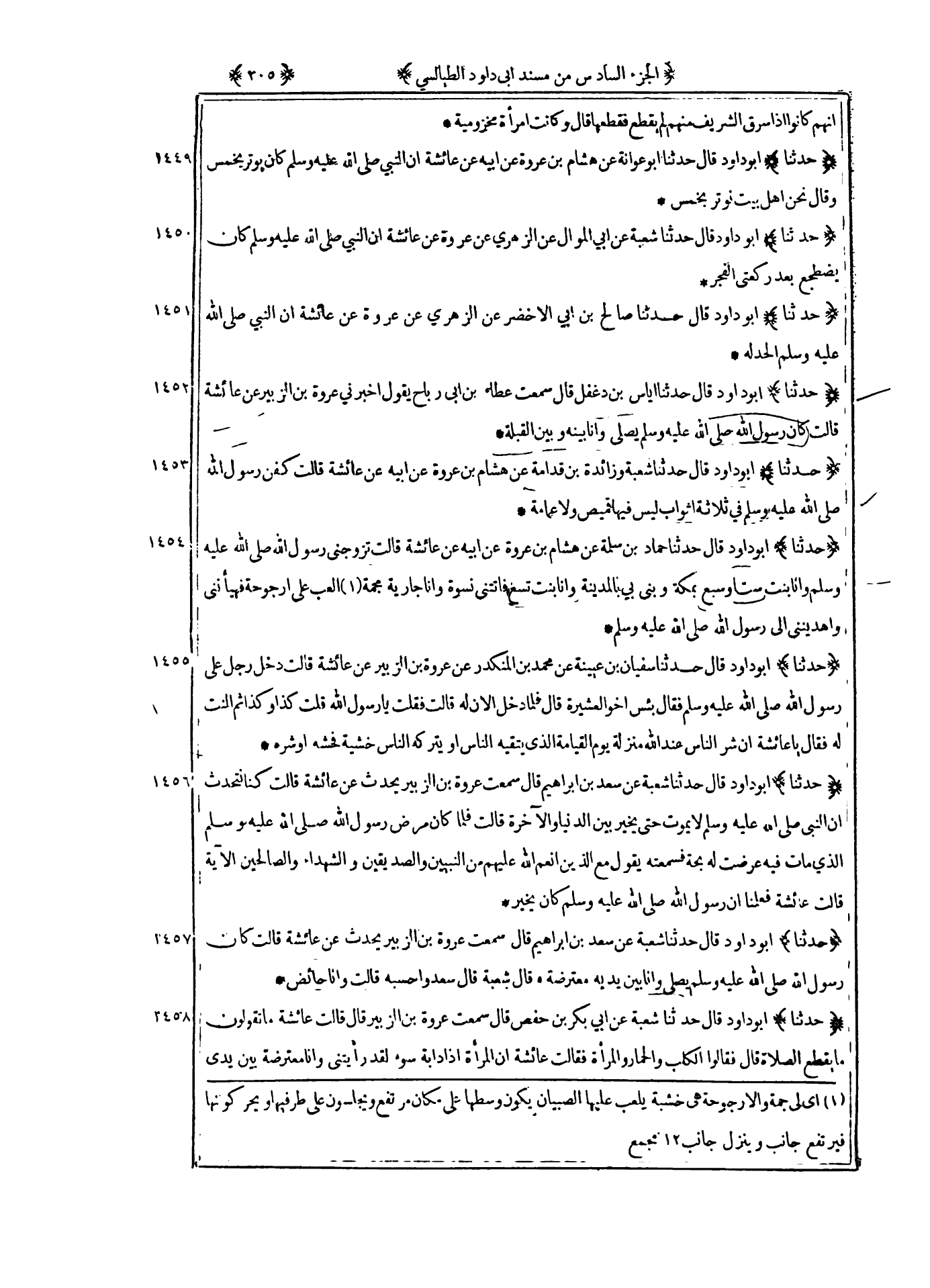 1449 - حدثنا أبو داود قال حدثنا أبو عوانة عن هشام بن عروة عن أبيه عن عائشة : ان النبي صلى الله عليه و سلم كان يوتر بخمس وقال نحن أهل بيت نوتر بخمس