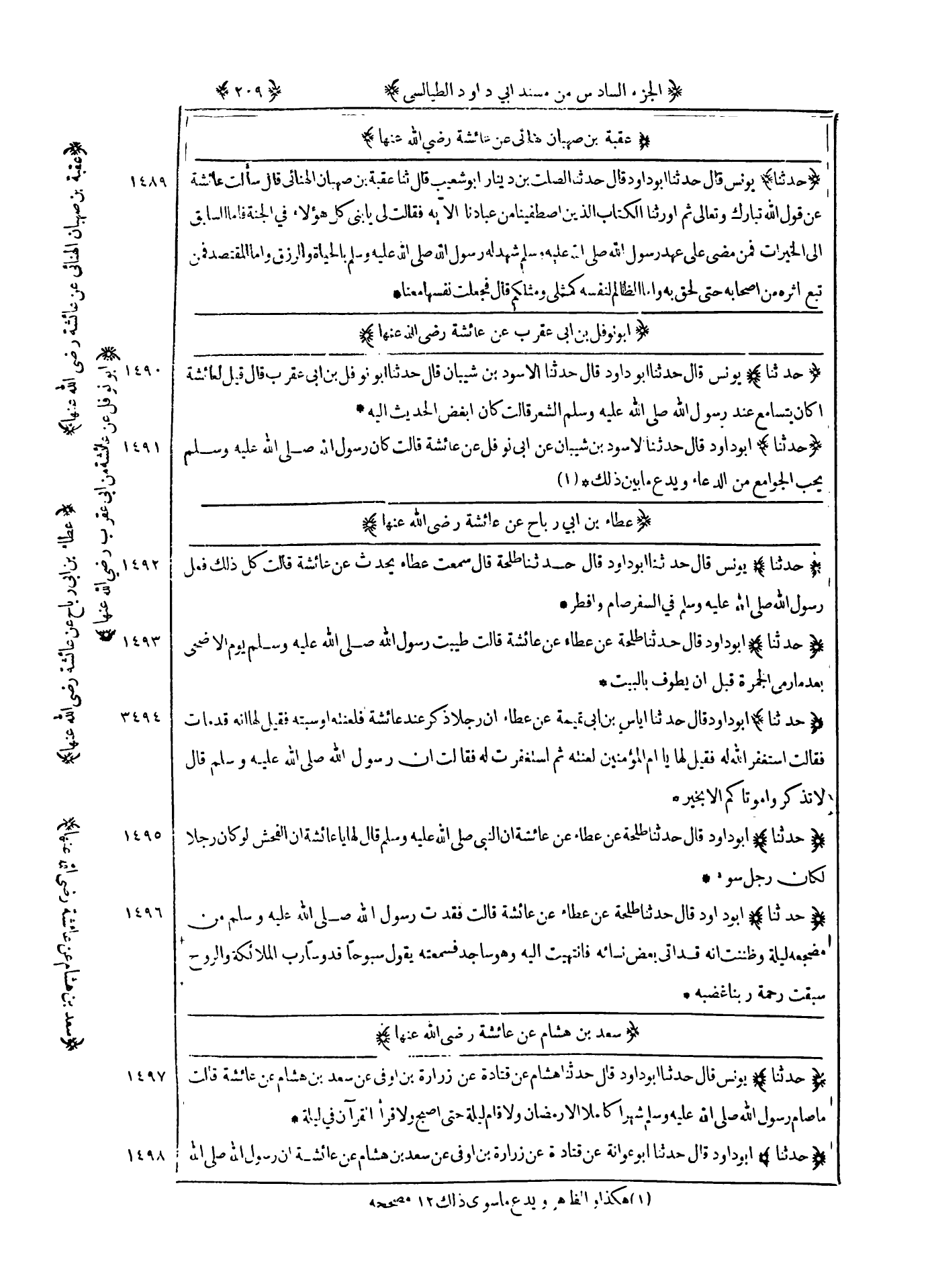 1490 - حدثنا يونس قال حدثنا أبو داود قال حدثنا الأسود بن شيبان قال حدثنا أبو نوفل بن أبى عقرب قال قيل لعائشة : أكان يتسامع عند رسول الله صلى الله عليه و سلم الشعر قالت كان ابغض الحديث اليه