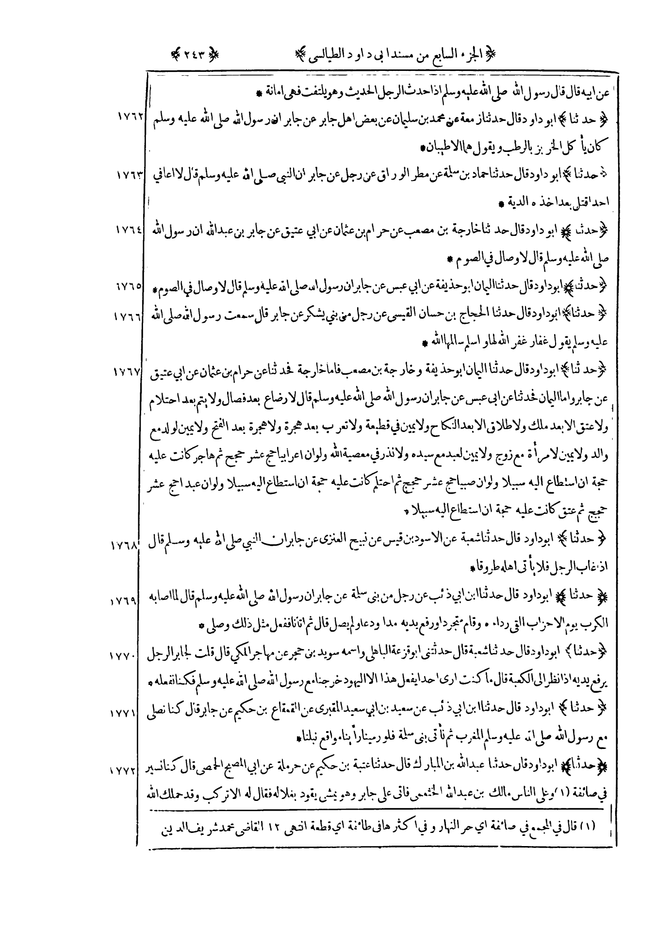 1767 - حدثنا أبو داود قال حدثنا اليمان أبو حذيفة وخارجة بن مصعب فاما خارجة فحدثنا عن حرام بن عثمان عن أبي عتيق عن جابر وأما اليمان فحدثنا عن أبي عبس عن جابر ان رسول الله صلى الله عليه و سلم قال : لا رضاع بعد فصال ولا يتم بعد احتلام ولا عتق إلا بعد ملك ولا طلاق الا بعد النكاح ولا يمين في قطيعة ولا تغرب بعد هجرة ولا هجرة بعد الفتح ولا يمين لولد مع والد ولا يمين لامرأة مع زوج ولا يمين لعبد مع سيده ولا نذر في معصية الله ولو ان أعرابيا حج عشر حجج ثم هاجر كانت عليه حجة ان استطاع اليه سبيلا ولو ان صبيا حج عشر حجج ثم احتلم كانت عليه حجة أن استطاع عليه سبيلا ولو أن عبدا حج عشر حجج ثم عتق كانت عليه حجة ان استطاع اليه سبيلا