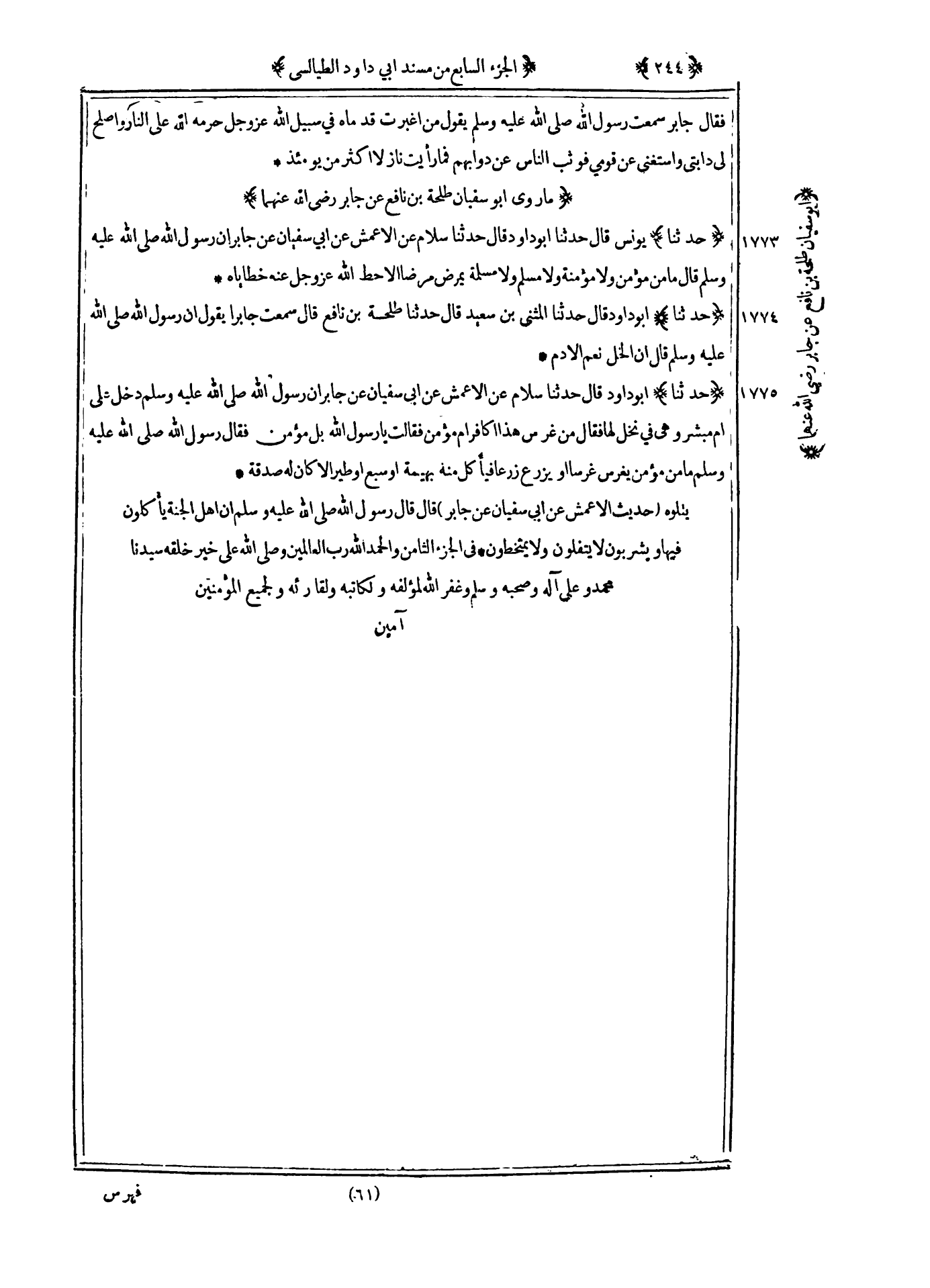 1775 - حدثنا أبو داود قال حدثنا سلام عن الأعمش عن أبي سفيان عن جابر : ان رسول الله صلى الله عليه و سلم دخل على أم مبشر وهى في نخل لها فقال من غرس هذا أكافر أم مؤمن فقال يا رسول الله بل مؤمن فقال رسول الله صلى الله عليه و سلم ما من مؤمن يغرس غرسا أو يزرع زرعا فيأكل منه بهيمة أو سبع أو طير الا كان له صدقة يتلوه حديث الأعمش عن أبي سفيان عن جابر قال قال رسول الله صلى الله عليه و سلم ان أهل الجنة يأكلون فيها ويشربون لا يتفلون ولا يتمخطون في الجزء الثامن والحمد الله رب العالمين وصلى الله على خير خلقه سيدنا محمد وعلى اله وصحبة وغفر الله لمؤلفه ولكاتبه ولقارئه ولجميع المؤمنين امين فهرس الجزء الثامن من مسند أبو داود الطيالسي رحمه الله تعالى رواية أبي بشر يونس بن حبيب بن عبد القاهر العجلي عنه رواية أبي محمد بن عبد الله بن جعفر بن أحمد بن فارس عنه رواية الامام أبي نعيم أحمد بن عبد الله بن أحمد بن إسحاق الحافظ عنه رواية أبي علي الحسن بن أحمد بن الحسن الحداد المقري عنه رواية الشيخ الأصيل أبي سعيد خليل بن أبي الرجاء بن أبي الفتح الصوفي عنه فيه بقية حديث جابر وعبد الله بن عمرو وأنس بن مالك رضي الله عنهم [ ص 245 ] [ ص 246 ] بسم الله الرحمن الرحيم أخبرنا الشيخ الأصيل أبو سعيد خليل بن أبي الرجاء بن أبي الفتح الداراني الصوفي قراءة عليه قال أخبرنا أبو علي الحسن بن أحمد بن الحسن الحداد المقرى قراءة عليه وانا اسمع في صفر سنة اثنتي عشرة وخمسمائة قال أخبرنا الامام أبو نعيم أحمد بن عبد الله بن أحمد بن إسحاق الحافظ قراءة عليه وانا اسمع قال حدثنا أبو محمد عبد الله بن جعفر بن أحمد بن فارس قال أبو بشر يونس بن حبيب بن عبد القاهر العجلي قال