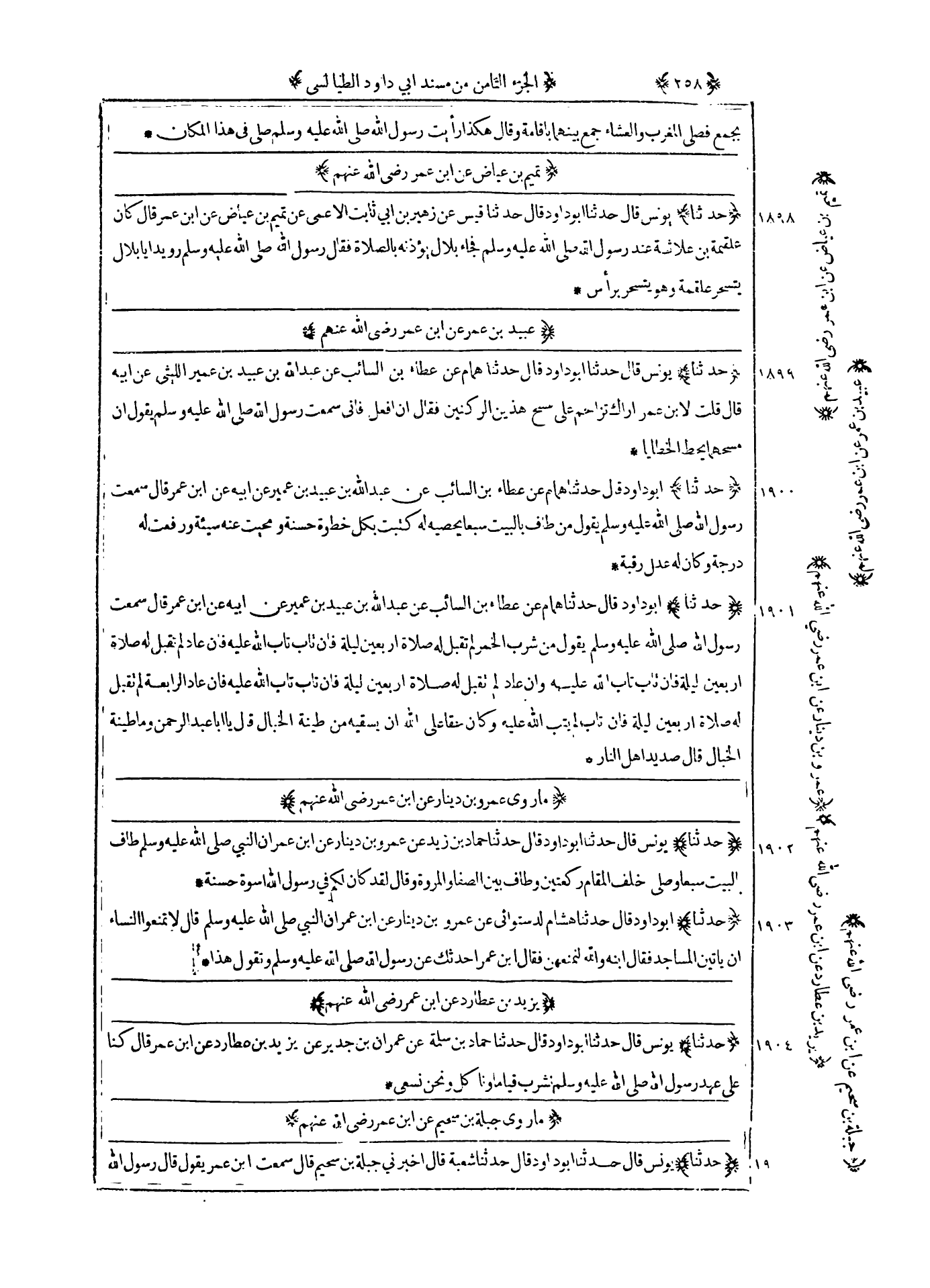 1904 - حدثنا يونس قال حدثنا أبو داود قال حدثنا حماد بن سلمة عن عمر بن جدير عن يزيد بن عطاء عن بن عمر قال : كنا على عهد رسول الله صلى الله عليه و سلم نشرب قياما ونأكل ونحن نسعى