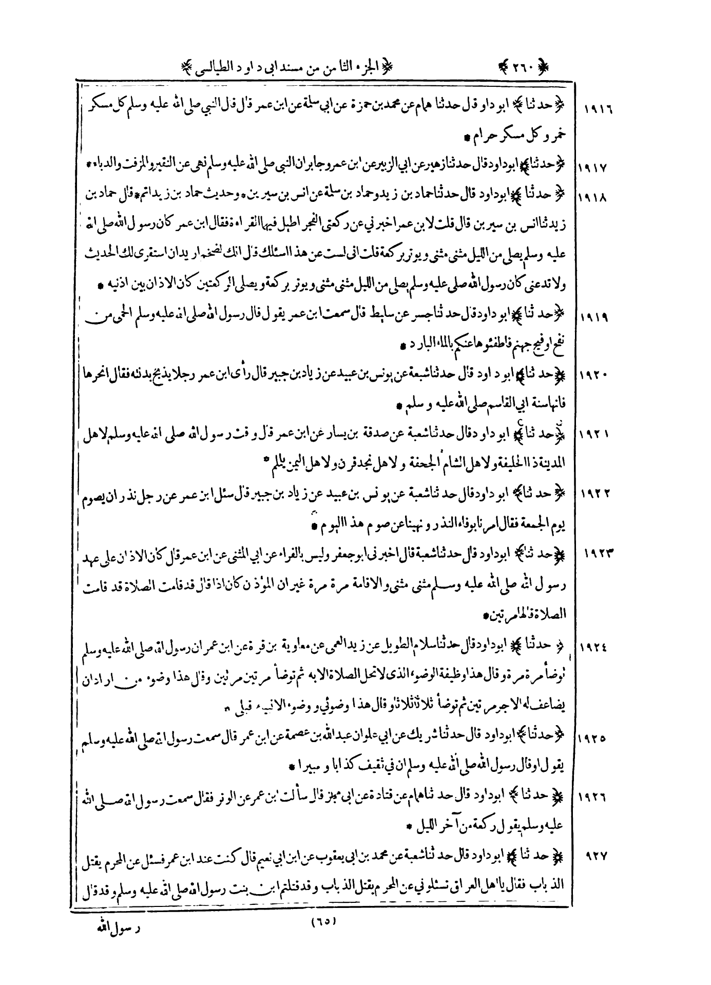1918 - حدثنا أبو داود قال حدثنا حماد بن زيد وحماد بن سلمة عن أنس بن سيرين وحديث حماد بن زيد أتم قال حماد بن زيد ثنا أنس بن سيرين قال قلت لابن عمر أخبرني عن ركعتين الفجر أطيل فيها القراءة فقال بن عمر : كان رسول الله صلى الله عليه و سلم يصلى من الليل مثنى مثنى ويوتر بركعة قلت انى لست عن هذه اسئلك قال انك لضخم أريد ان استقرى لك الحديث ولا تدعنى كان رسول الله صلى الله عليه و سلم يصلى من الليل مثنى مثنى ويوتر بركعة ويصلى الركعتين كان الأذان بين اذنيه