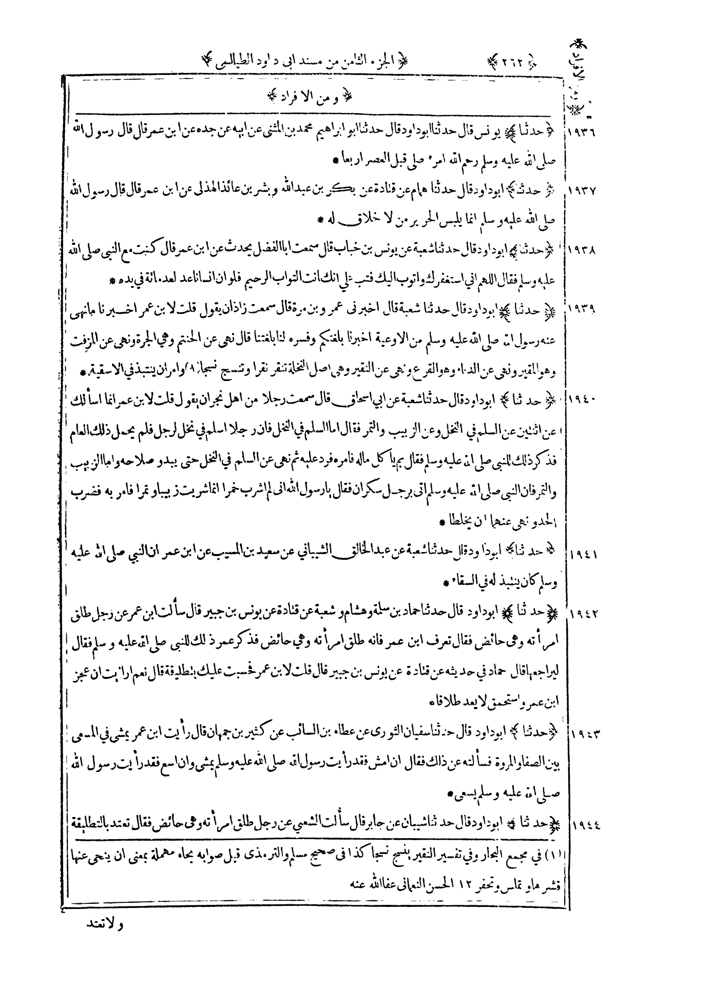 1936 - حدثنا يونس قال حدثنا أبو داود قال حدثنا أبو إبراهيم محمد بن المثنى عن أبيه عن جده عن بن عمر قال قال رسول الله صلى الله عليه و سلم : رحم الله امرء صلى قبل العصر أربعا