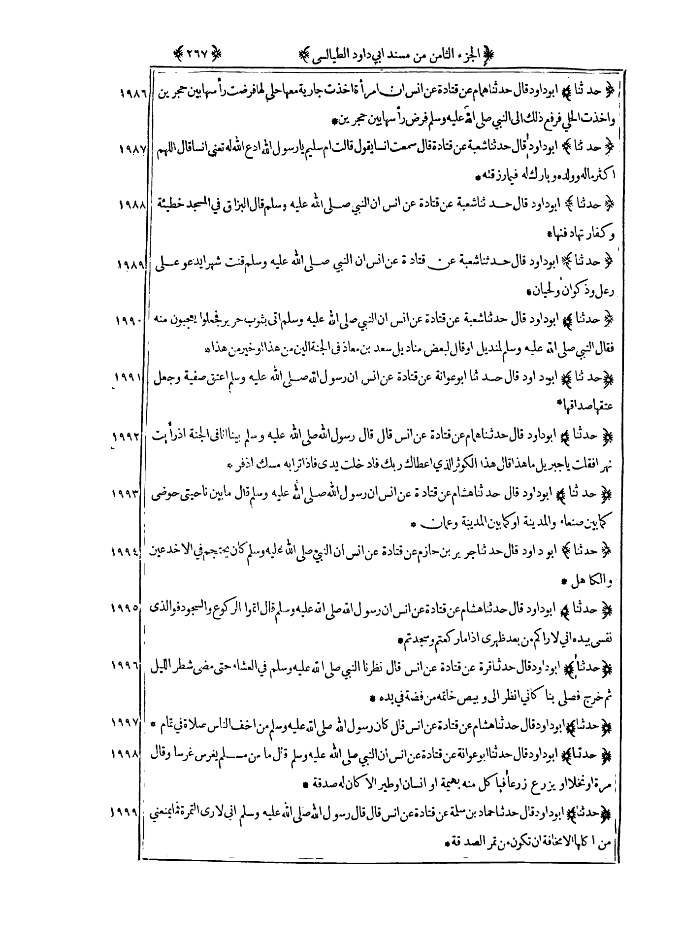 1999 - حدثنا أبو داود قال حدثنا حماد بن سلمة عن قتادة عن أنس قال قال رسول الله صلى الله عليه و سلم : اني لأرى التمرة فما يمنعني من أكلها الا مخافة ان تكون من تمر الصدقة