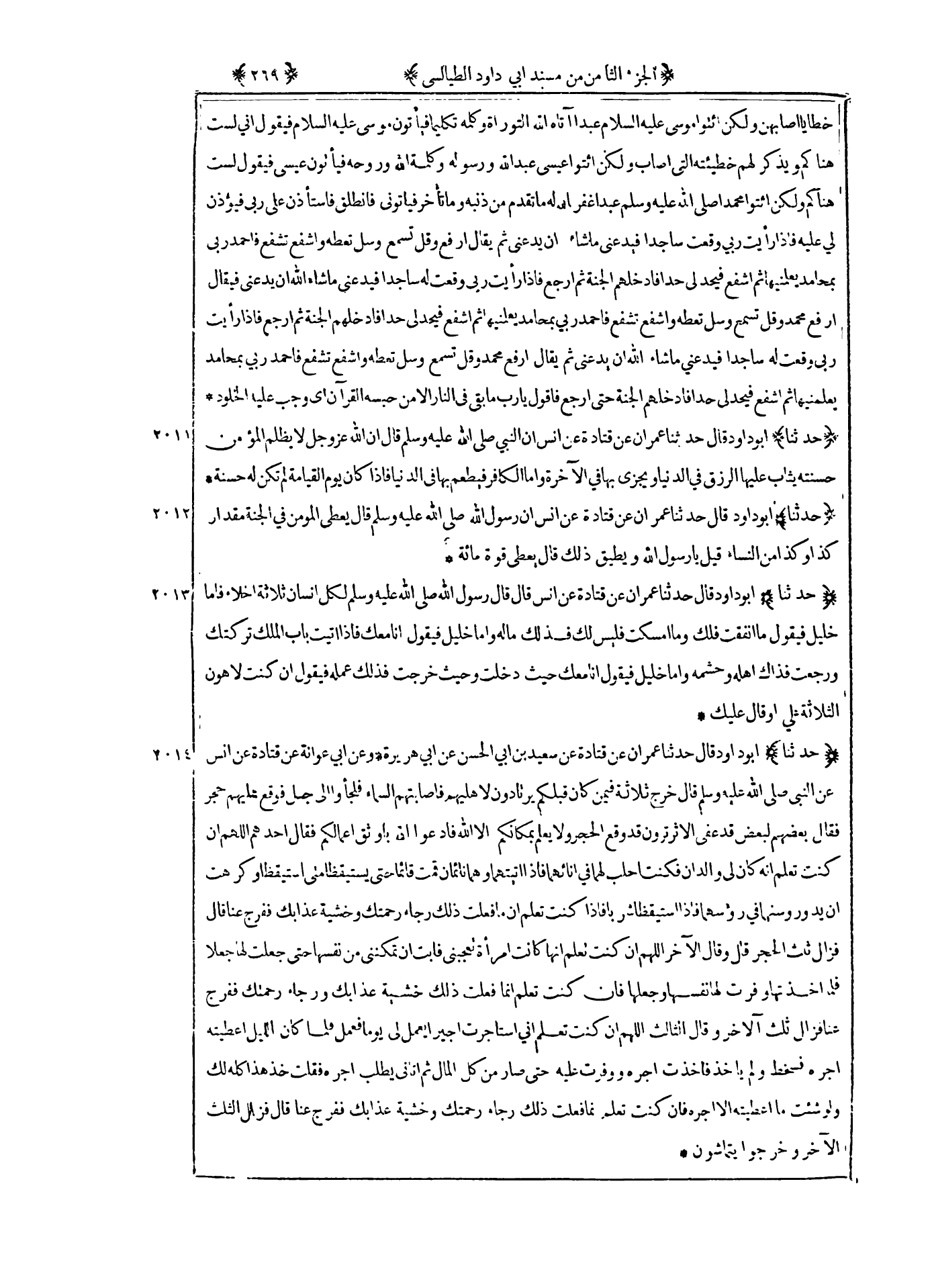 2012 - حدثنا أبو داود قال حدثنا عمران عن قتادة عن أنس ان رسول الله صلى الله عليه و سلم قال : يعطى المؤمن في الجنة مقدار كذا وكذا من النساء قيل يا رسول الله ويطيق ذلك قال يعطى قوة مائة