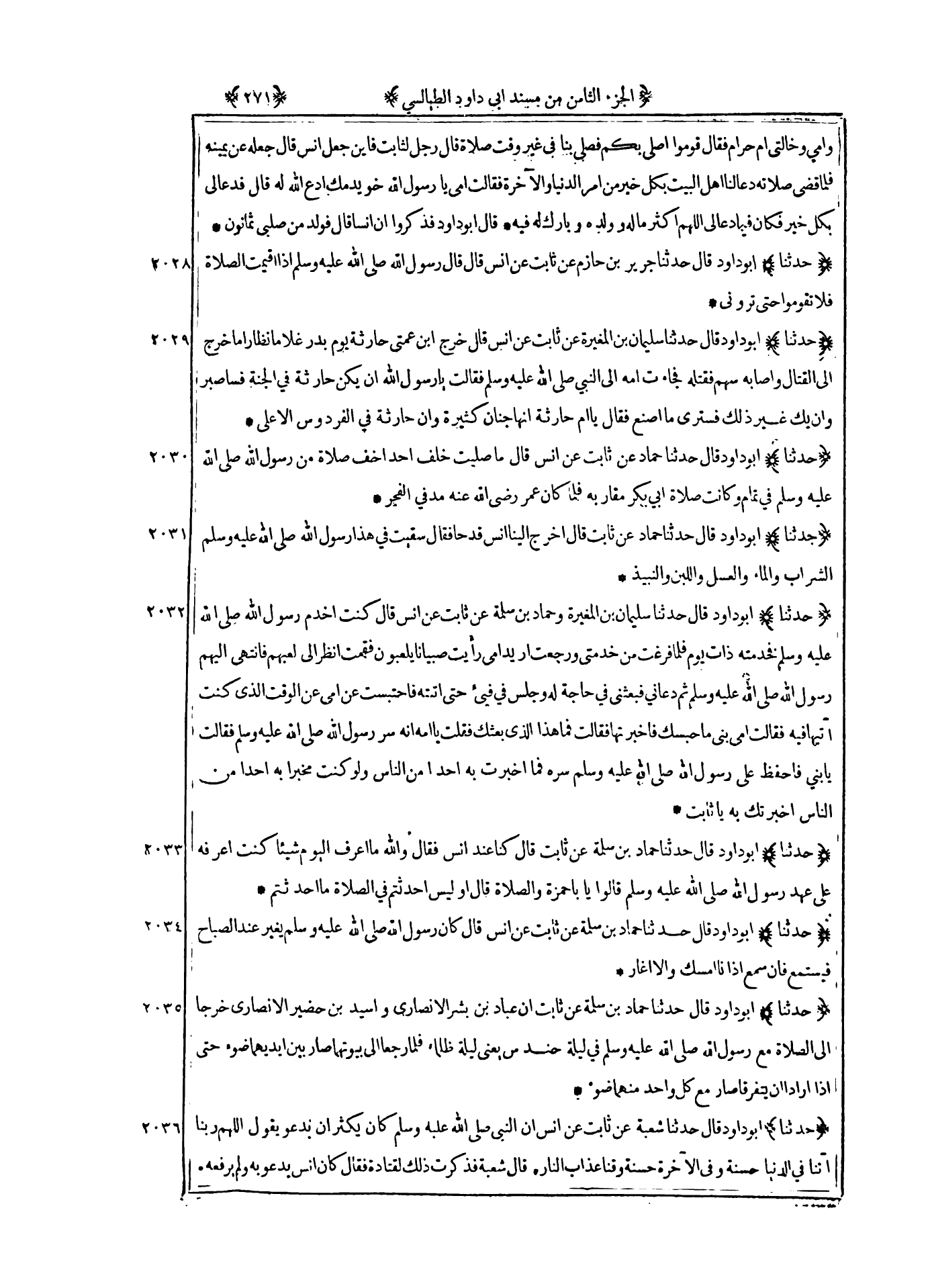 2034 - حدثنا أبو داود قال حدثنا حماد بن سلمة عن ثابت عن أنس قال : كان رسول الله صلى الله عليه و سلم يغير عند الصباح فيستمع فإن سمع إذ أنا امسك والا أغار