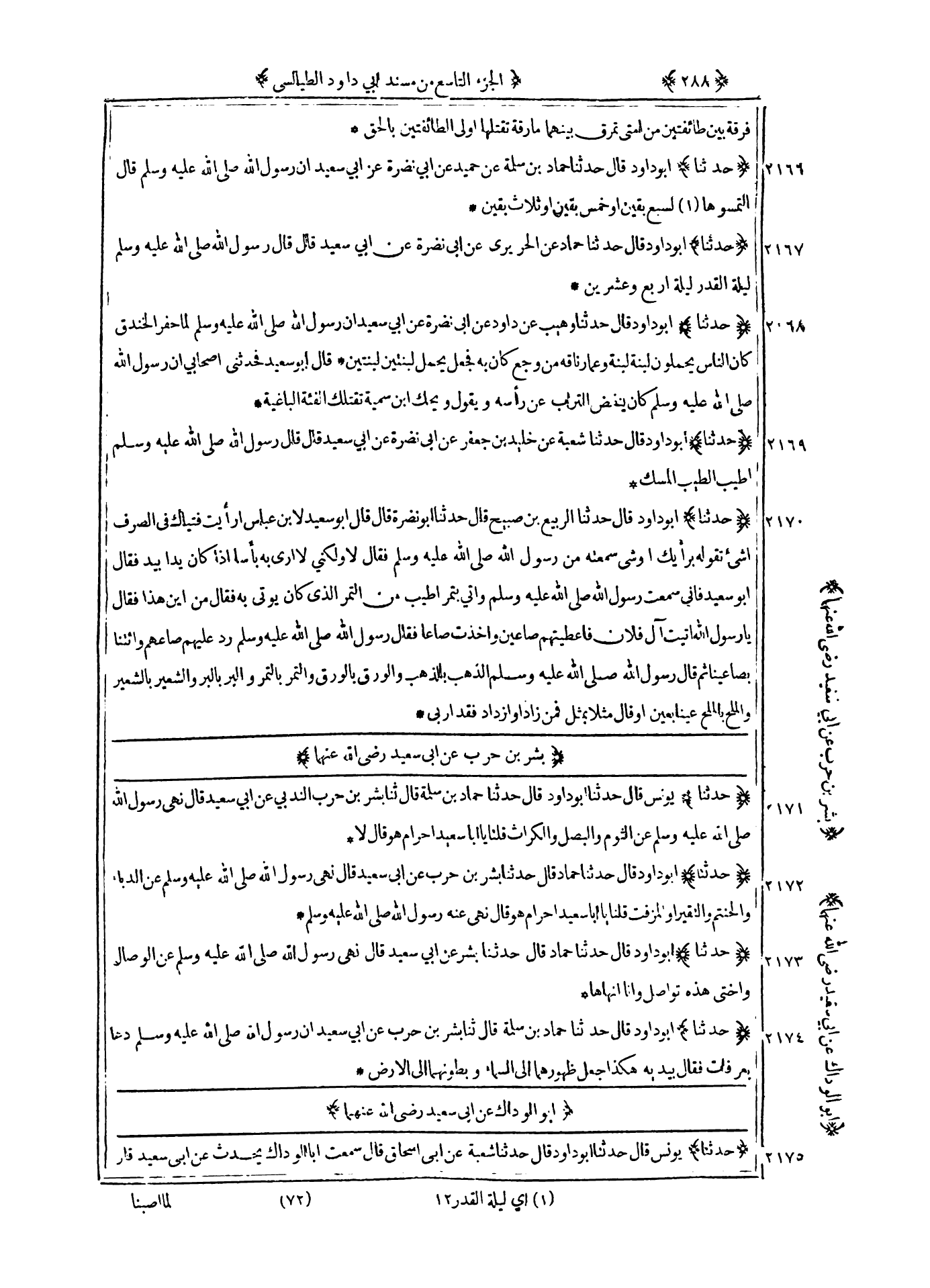 2167 - حدثنا أبو داود قال حدثنا حماد عن الحريري عن أبي نضرة عن أبي سعيد قال قال رسول الله صلى الله عليه و سلم : ليلة القدر ليلة أربع وعشرين