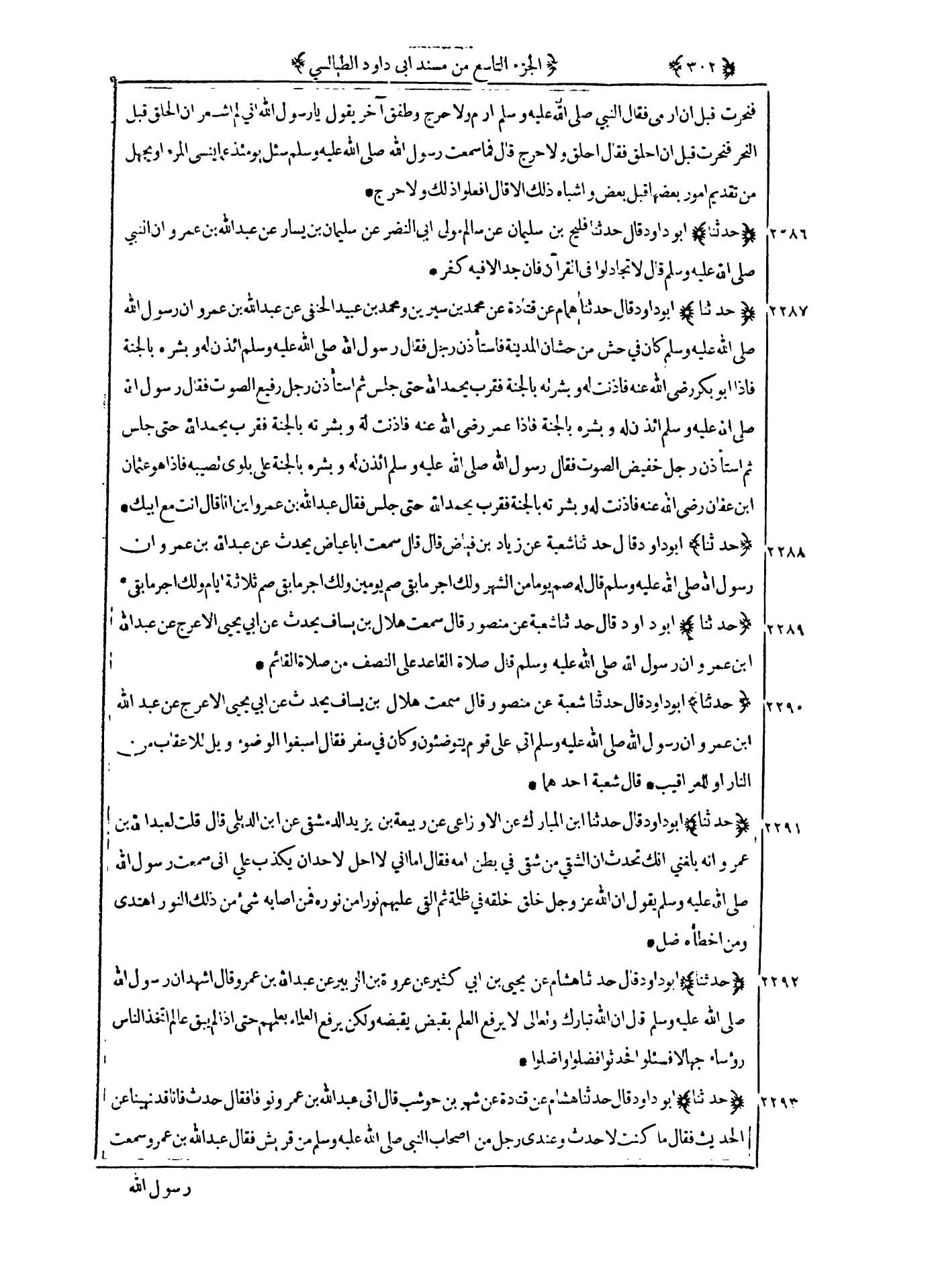 2292 - حدثنا أبو داود قال حدثنا هشام عن يحيى بن أبي كثير عن عروة بن الزبير عن عبد الله بن عمرو قال اشهد ان رسول الله صلى الله عليه و سلم قال : ان الله تبارك وتعالى لا يرفع العلم بقبض يقبضه ولكن يرفع العلماء بعلمهم حتى إذا لم يبق عالم اتخذ الناس رؤساء جهالا فسئلوا فحدثوا فضلوا واضلوا