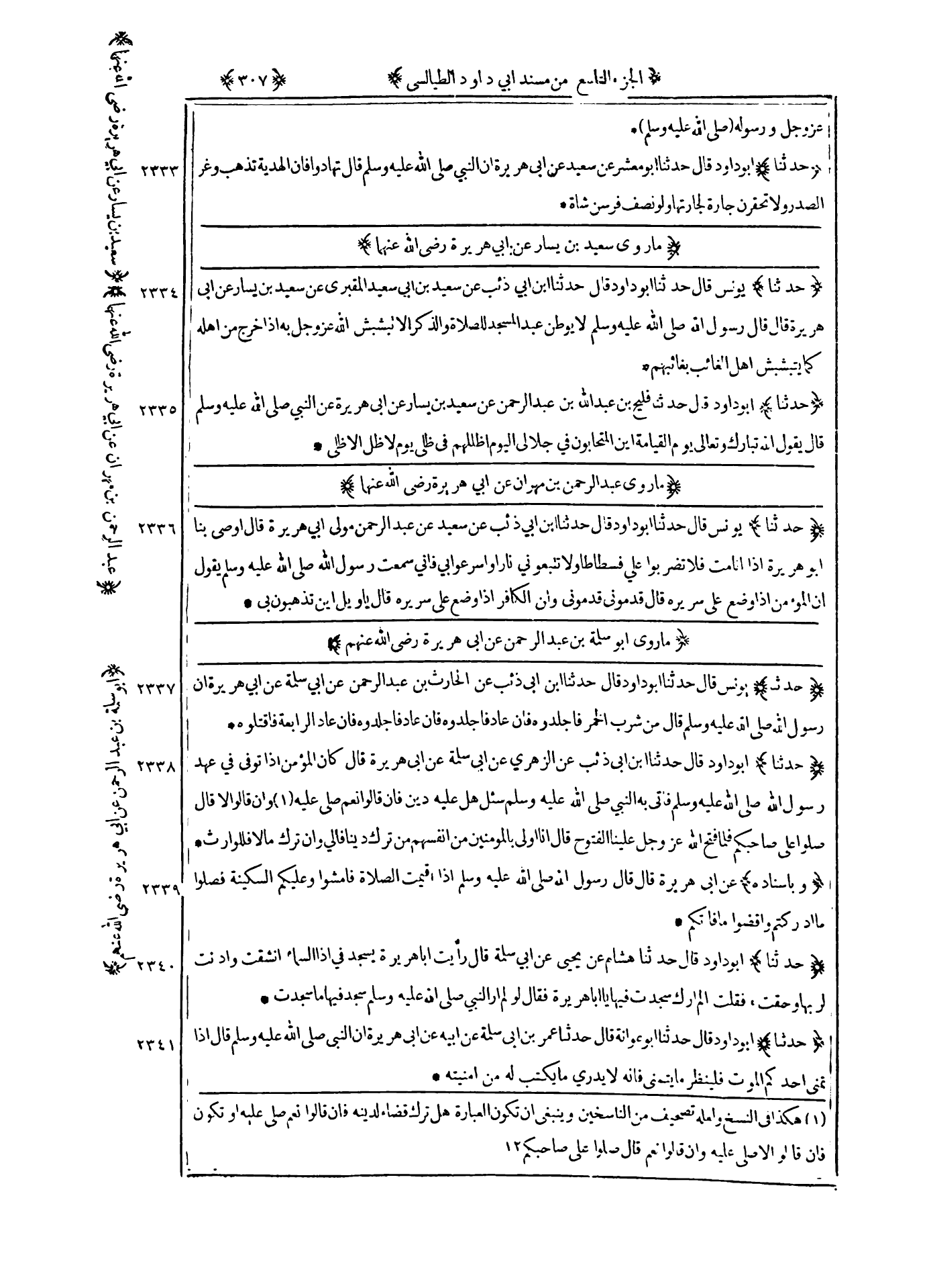 2334 - حدثنا يونس قال حدثنا أبو داود قال حدثنا بن أبي ذئب عن سعيد بن أبي سعيد المقبري عن سعيد بن يسار عن أبي هريرة قال قال رسول الله صلى الله عليه و سلم : لا يوطن عبد المسجد للصلاة والذكر الا تبشبش الله عز و جل به إذا خرج من أهله كما يتبشبش أهل الغائب بغائبهم