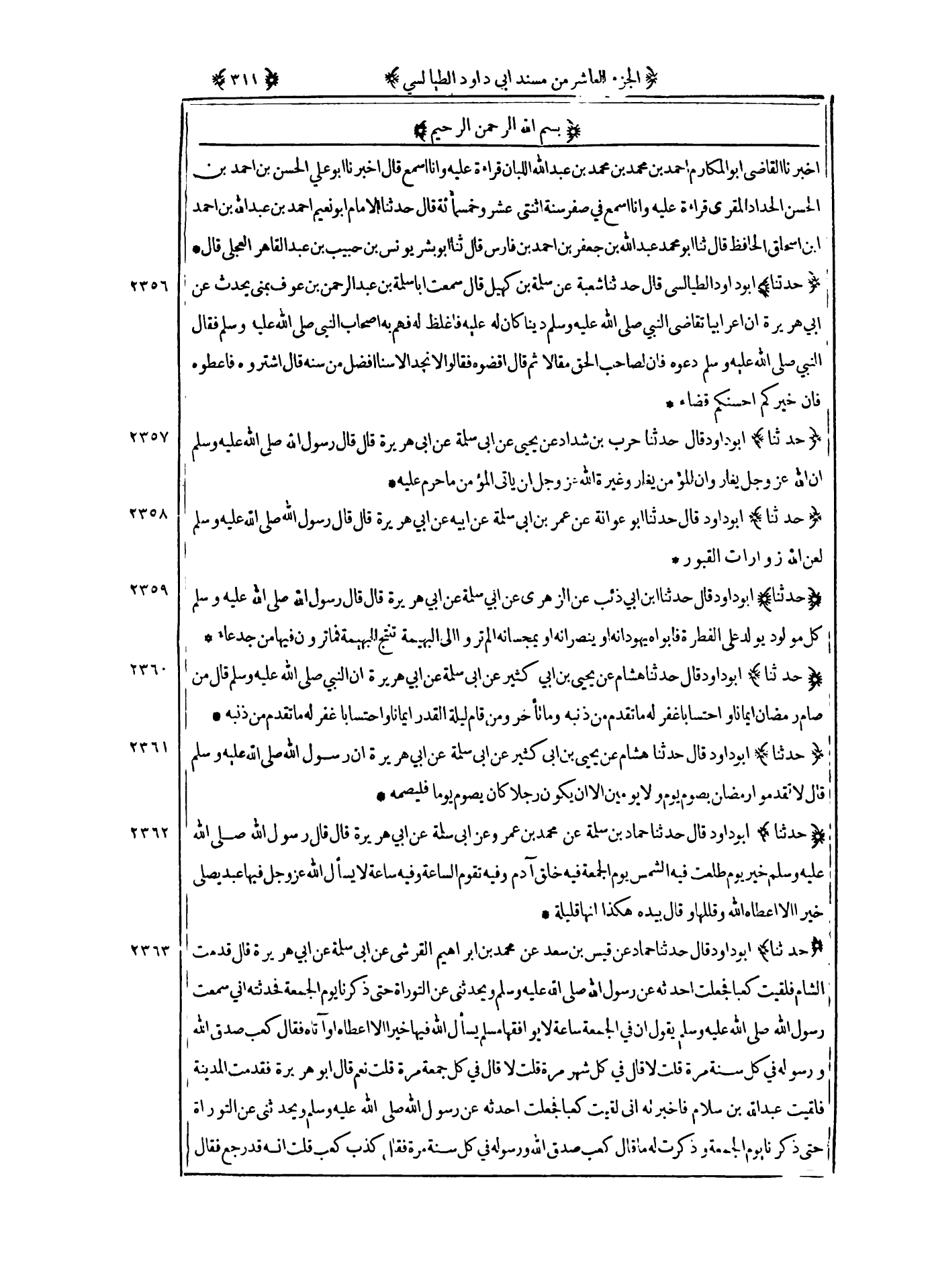 2363 - حدثنا أبو داود قال حدثنا حماد عن قيس بن سعد عن محمد بن إبراهيم القرشي عن أبي سلمة عن أبي هريرة قال قدمت الشام فلقيت كعبا فجعلت أحدثه عن رسول الله صلى الله عليه و سلم ويحدثنى عن التوراة حتى ذكرنا يوم الجمعة فحدثته اني سمعت رسول الله صلى الله عليه و سلم يقول : ان في الجمعة ساعة لا يوافقها مسلم يسأل الله فيها خير الا أعطاه وآتاه فقال كعب صدق الله ورسوله في كل سنة مرة قلت لا قال في كل شهر مرة قلت لا قال في كل جمعة مرة قلت نعم قال أبو هريرة فقدمت المدينة فلقيت عبد الله بن سلام فأخبرته اني لقيت كعبا فجعلت أحدثه عن رسول الله صلى الله عليه و سلم ويحدثنى عن التوراة حتى ذكرنا يوم الجمعة وذكرت له ما قال كعب صدق الله ورسوله في كل سنة مرة فقال كذب كعب قلت انه قد رجع فقال أتدري أي ساعة قلت وتهالكت عليه أخبرني أخبرني قال هي ما بين العصر الى المغرب قلت وكيف ولا صلاة فقال اما سمعت رسول الله صلى الله عليه و سلم يقول ان العبد لا يزال في صلاة منتظر الصلاة تقول الملائكة اللهم اغفر له اللهم ارحمه
