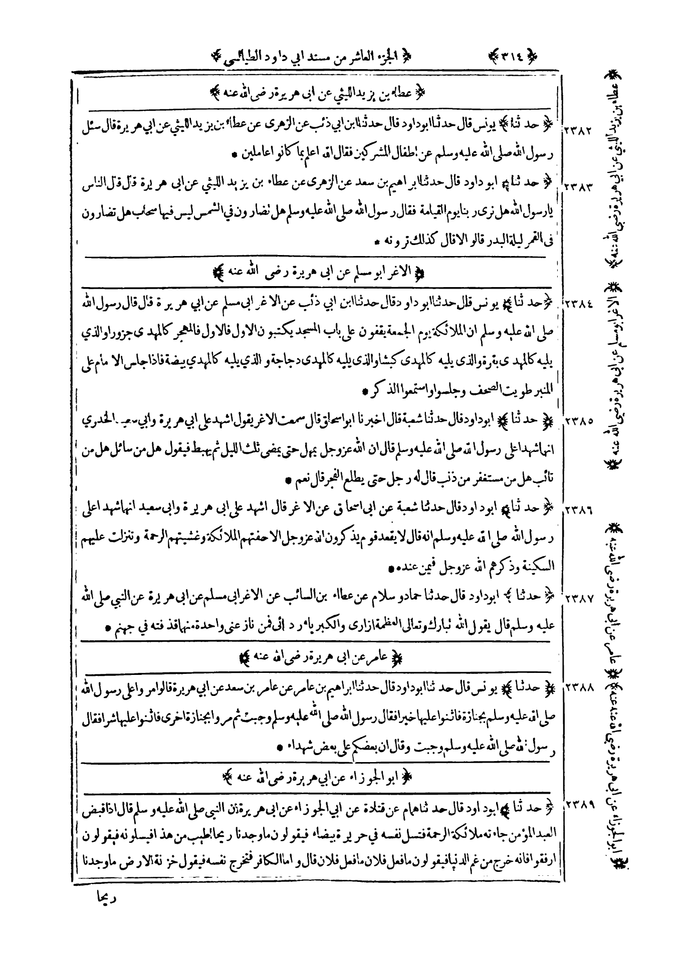 2383 - حدثنا أبو داود قال حدثنا إبراهيم بن سعد عن الزهرى عن عطاء بن يزيد الليثي عن أبي هريرة قال قال الناس : يا رسول الله هل نرى ربنا يوم القيامة فقال رسول الله صلى الله عليه و سلم هل تضارون في الشمس ليس فيها سحاب هل تضارون في القمر ليلة البدر قالوا لا قال كذلك ترونه