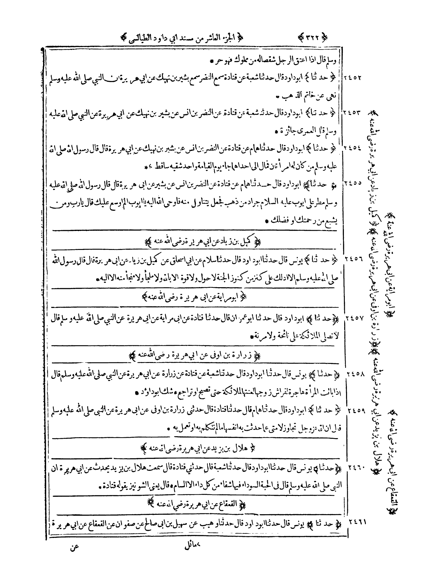 2453 - حدثنا أبو داود قال حدثنا شعبة عن قتادة عن النضر بن أنس عن بشير بن نهيك عن أبي هريرة عن النبي صلى الله عليه و سلم قال : العمرى جائزة