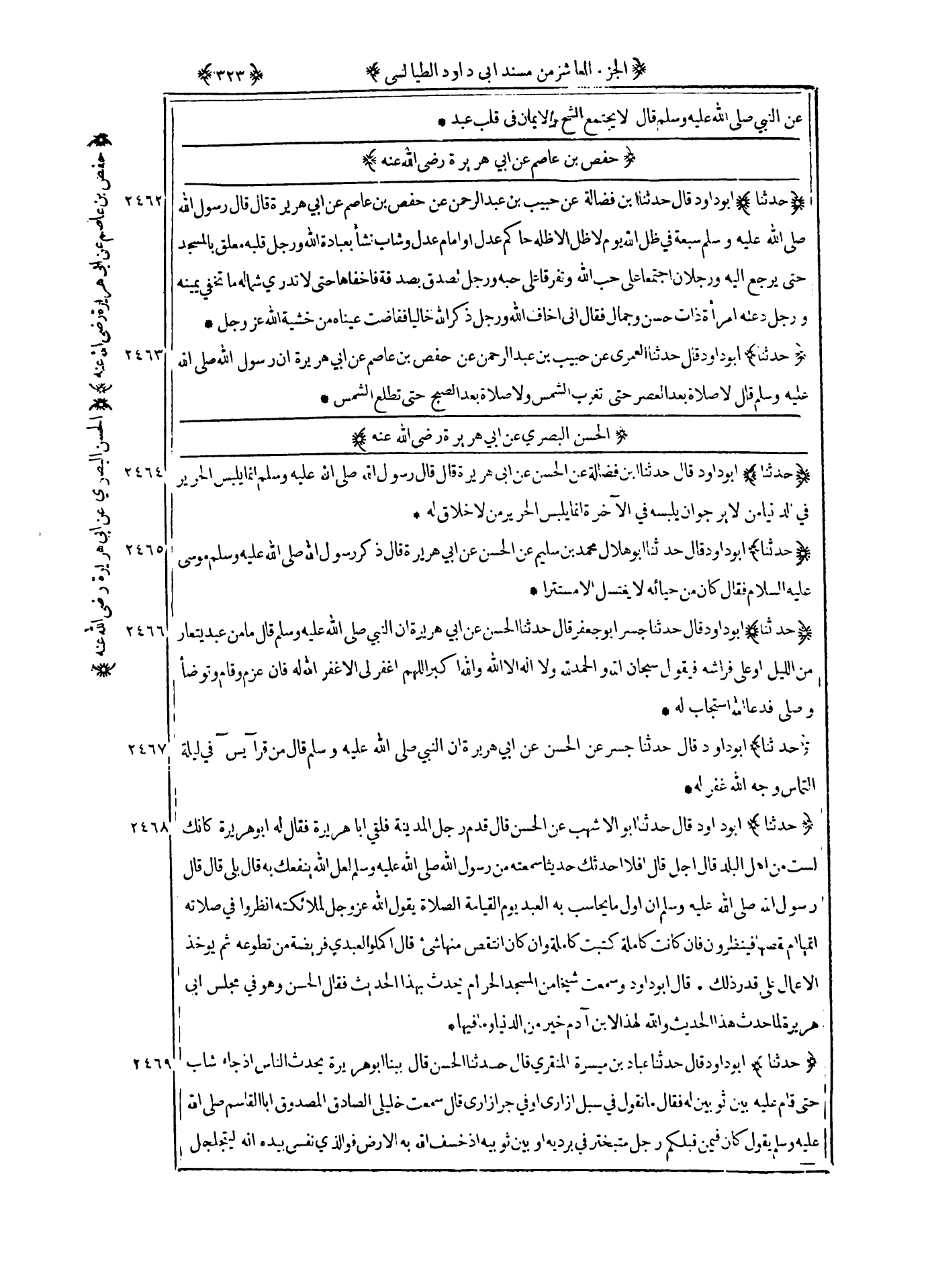2463 - حدثنا أبو داود قال حدثنا العمرى عن حبيب بن عبد الرحمن عن حفص بن عاصم عن أبي هريرة ان رسول الله صلى الله عليه و سلم قال : لا صلاة بعد العصر حتى تغرب الشمس ولا صلاة بعد الصبح حتى تطلع الشمس